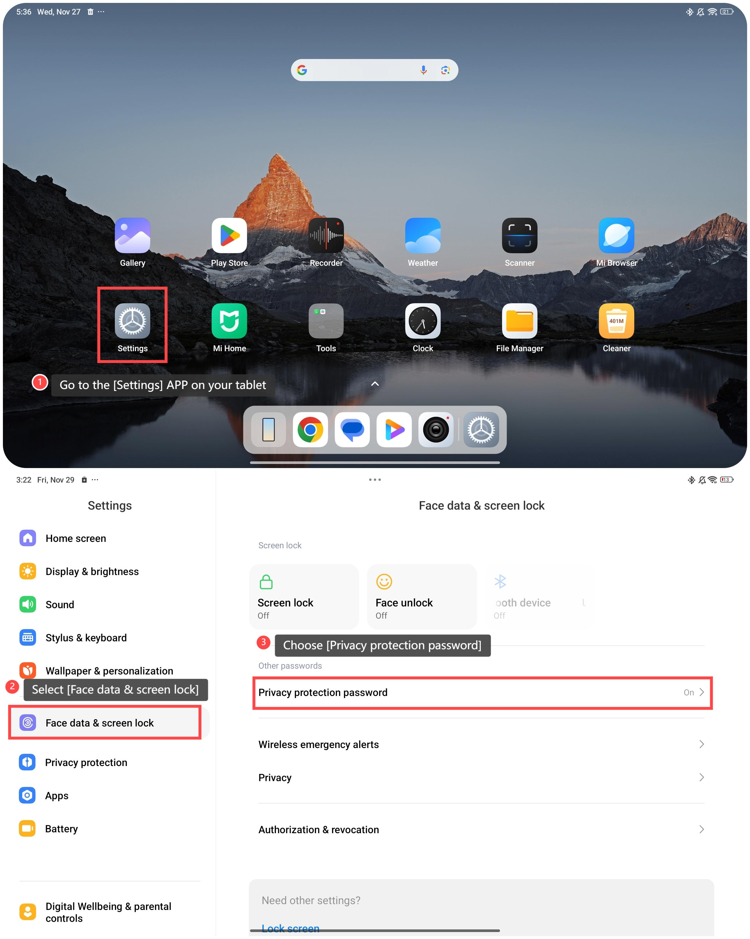 Redmi Pad Pro는 장치에 저장된 민감한 정보를 보호하는 개인 정보 보호 암호 구성을 지원합니다. 또한 다른 사람이 메모, 사진 및 기타 개인 콘텐츠를 못하도록 하여 개인 정보를 유지하는 데 도움이 될 수 있습니다.