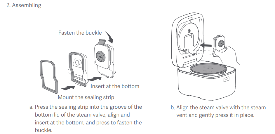 밥솥 사용 전후에 뚜껑과 스팀 밸브를 청소하여 요리 효과에 영향을 미치는 잔류 쌀국물을 방지하십시오.