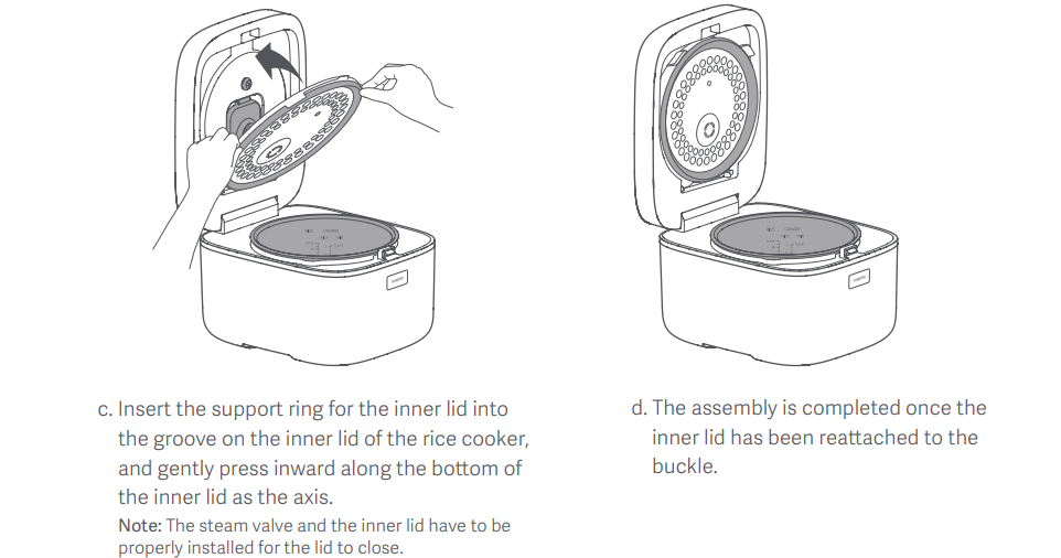 1. 밥솥의 안쪽 뚜껑이 없는지 확인하세요. 내부 뚜껑이 없으면 밥솥을 닫을 수 없습니다. 이 제품은 조리 중 누출 및 손상을 방지하도록 설계되었습니다.