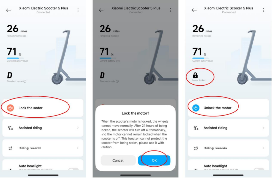 APP에서 [모터 잠금]을 탭하면 스쿠터가 모터 잠금 상태로 들어가고 24시간 후에 자동으로 종료되며 다시 켤 때 모터 잠금 상태를 유지합니다. 모터 잠금 상태에서 스쿠터를 누르면 대시보드에서 알람이 울리고 스쿠터 버튼을 누를 수 없습니다. 이 기능은 스쿠터 도난을 방지할 수 없으므로 스쿠터를 올바르게 보관하십시오. 모터 잠금 기능을 사용하면 스쿠터의 배터리가 소모되므로 이 기능을 합리적으로 사용하십시오.
