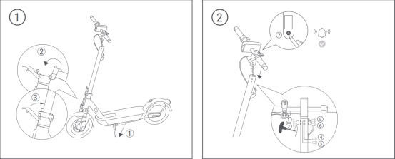 A: 패키지에서 스쿠터를 꺼낸 후 킥스탠드를 내려놓고 시트 튜브를 들어 올리고 접이식 버클을 조입니다. 그런 다음 패키지 상자에 있는 T형 렌치를 사용하여 시트 튜브의 3면에 있는 6개의 나사를 좌우-후 순으로 미리 조이고 스쿠터의 전면 위치를 고정한 후 완전히 조입니다.
