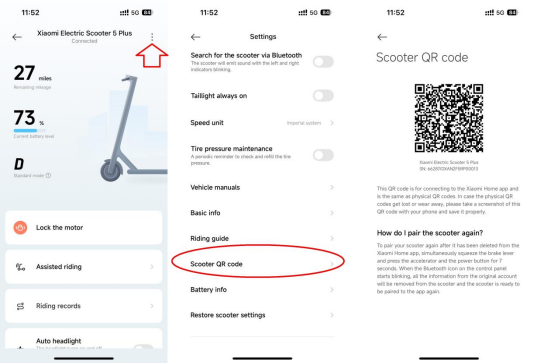 2. 스쿠터를 APP에 연결 한 후 Mi Home / Xiaomi Home APP >> [Xiaomi Electric Scooter 5 Plus]>> [ 스쿠터 QR 코드]>> 점 3 개 아이콘>> 스쿠터의 SN을 확인할 수 있습니다.