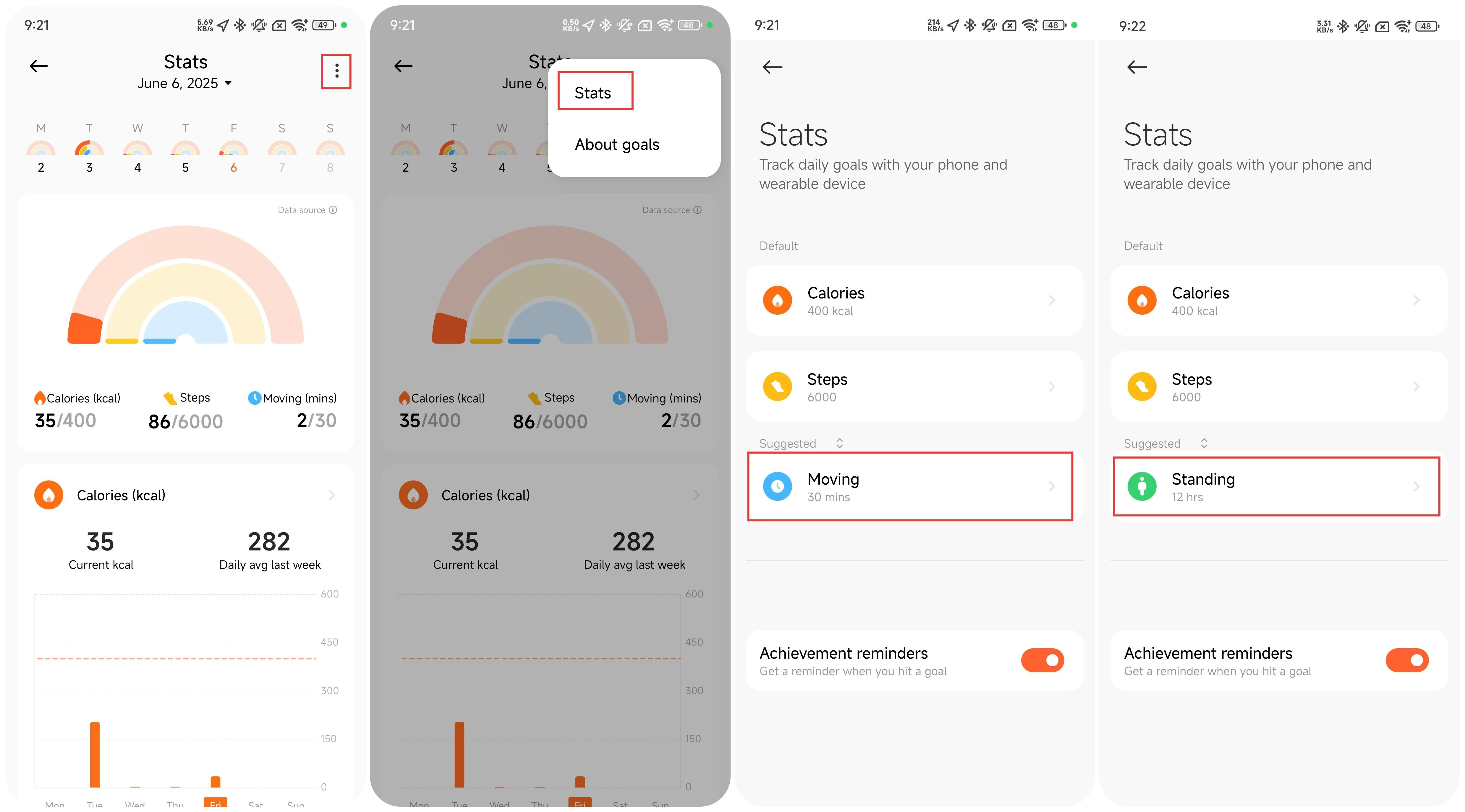 8. 스마트 밴드는 칼로리, 걸음 수, 서 있음, 움직이기를 포함한 활력 메트릭도 표시합니다(표시할 세 가지 선택 가능). 통계를 통해 일일 목표와 진행 상황을 쉽게 추적할 수 있습니다.