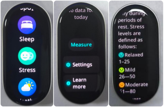 1. 스트레스 이모티콘: 밴드는 스트레스 수준을 시각화하는 데 도움이 되는 표현적인 이모티콘을 사용합니다. Mi Fitness APP에서 [건강] >> [스트레스] >> [스트레스 이모티콘]을 >>하거나 밴드의 앱 목록 >> [스트레스] >> [자세히 알아보기];