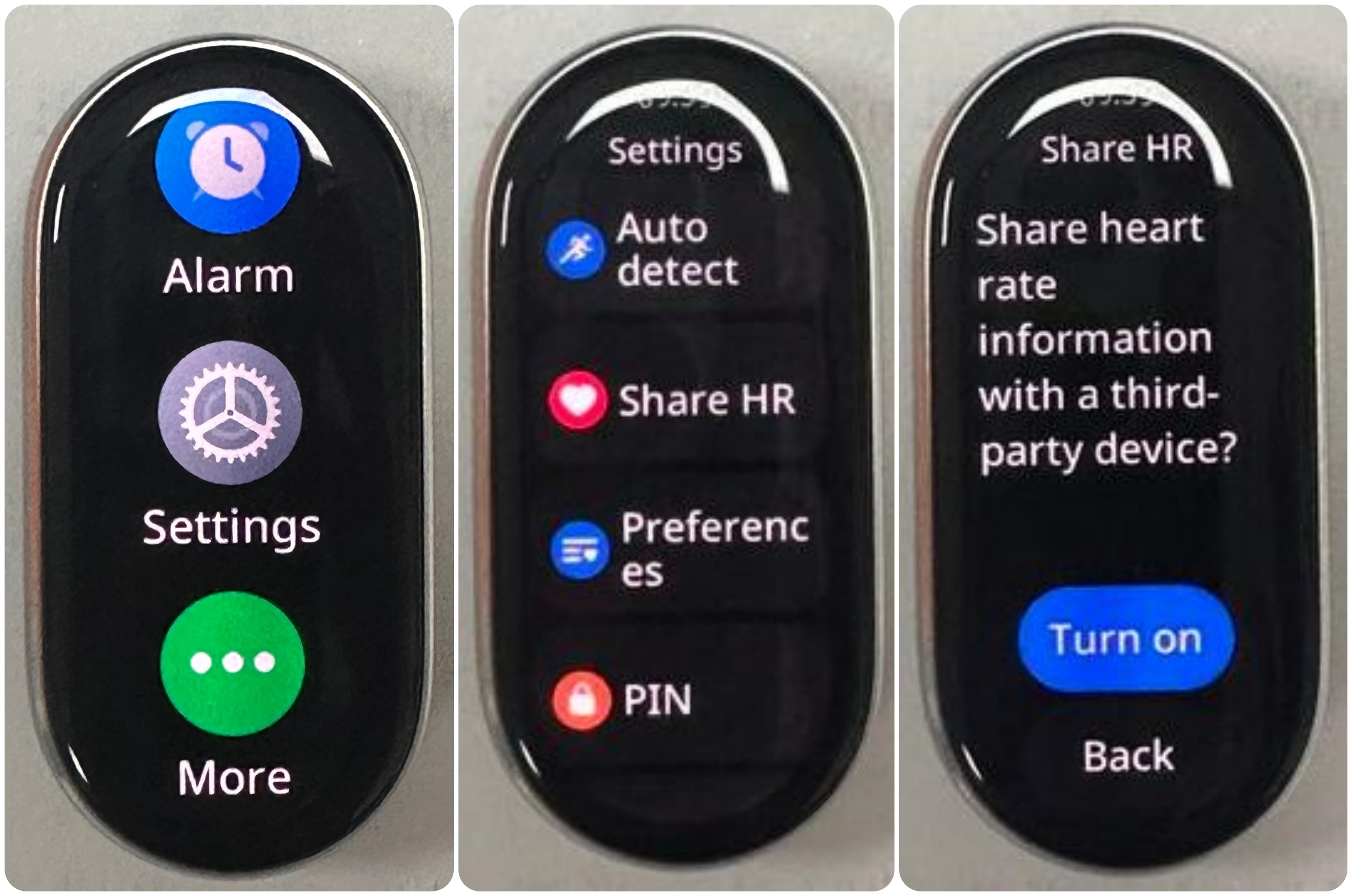 5. 블루투스 HR 브로드캐스트: 이 기능을 활성화하면 밴드는 블루투스를 통해 실시간 심박수 데이터를 심박수 브로드캐스트 수신을 지원하는 다른 장치로 전송할 수 있습니다. 활성화하려면 밴드의 APP 목록 >> [설정] >> [HR 공유] >> [켜기]로 이동합니다.