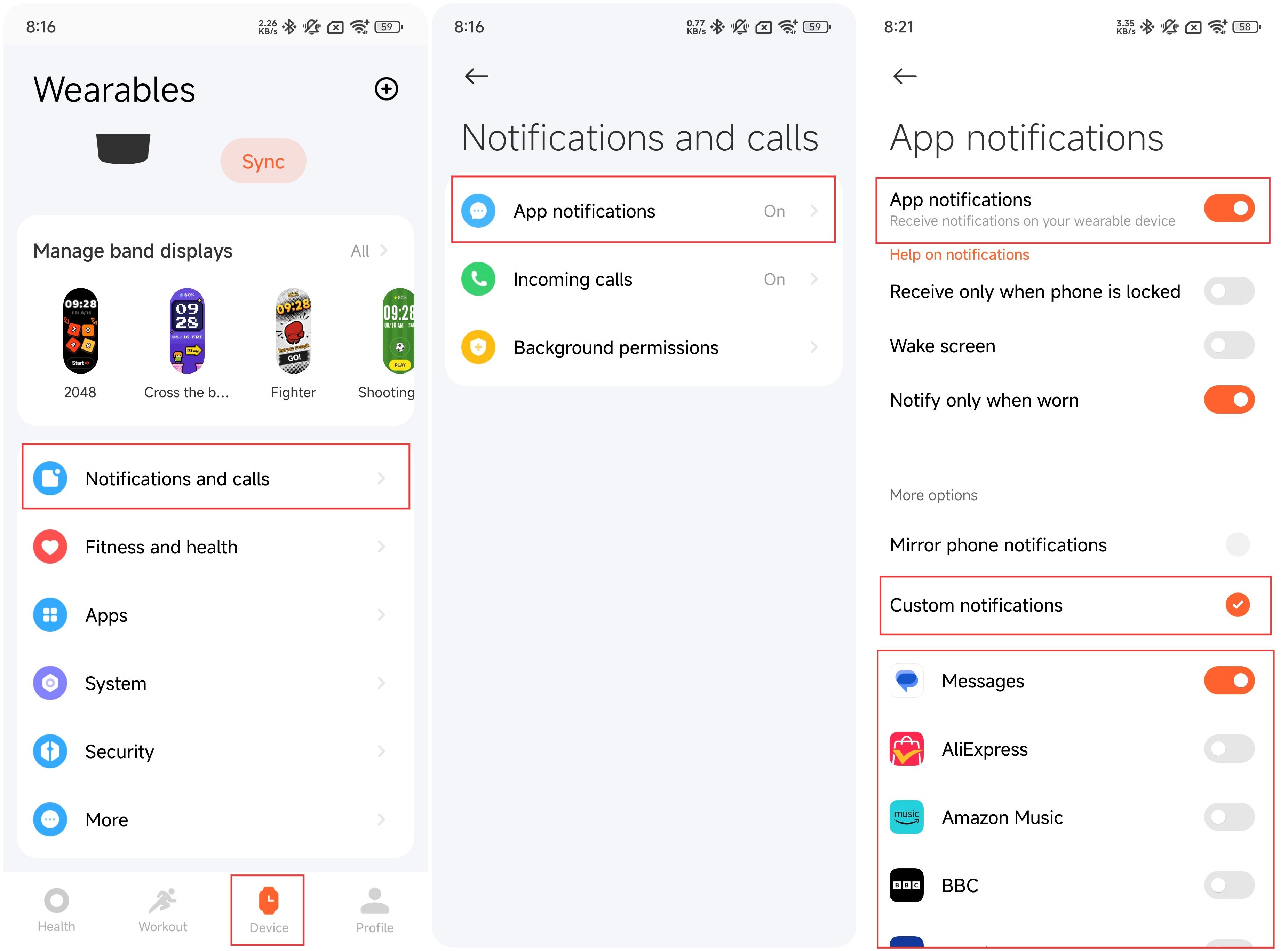 밴드에 추가되고 Mi Fitness APP에 추가된 알람([Device] >> [Apps] >> [Alarm])은 양방향으로 APP 및 밴드와 동기화할 수 있습니다. 추가된 알람은 삭제 및 동기화할 수 있습니다.