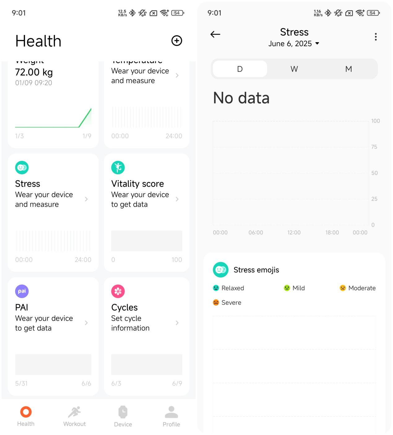 1. 스트레스 이모티콘: 밴드는 스트레스 수준을 시각화하는 데 도움이 되는 표현적인 이모티콘을 사용합니다. Mi Fitness APP에서 [Health] >> [Stress] >> [Stress emojis]를 >>하거나 밴드의 APP 목록 >>[Stress] >> [Learn more]로 이동하여 볼 수 있습니다.