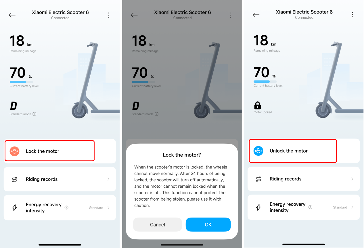 앱에서 [모터 잠금] 을(를) 탭한 후, 스쿠터는 모터 잠금 상태로 들어가며 24시간 후 자동으로 전원이 꺼집니다. 다시 전원을 켠 후에도 모터 잠금 상태는 유지됩니다. 모터 잠금 상태에서 스쿠터를 밀면 제어 패널에서 경보음이 울리며, 스쿠터의 버튼은 반응하지 않습니다. 이 기능은 도난 방지 기능을 제공하지 않으므로 스쿠터를 안전한 곳에 보관해 주십시오. 모터 잠금 기능을 사용하면 전동 스쿠터의 배터리 전력이 소모되므로, 이 기능을 신중하게 사용해 주십시오.