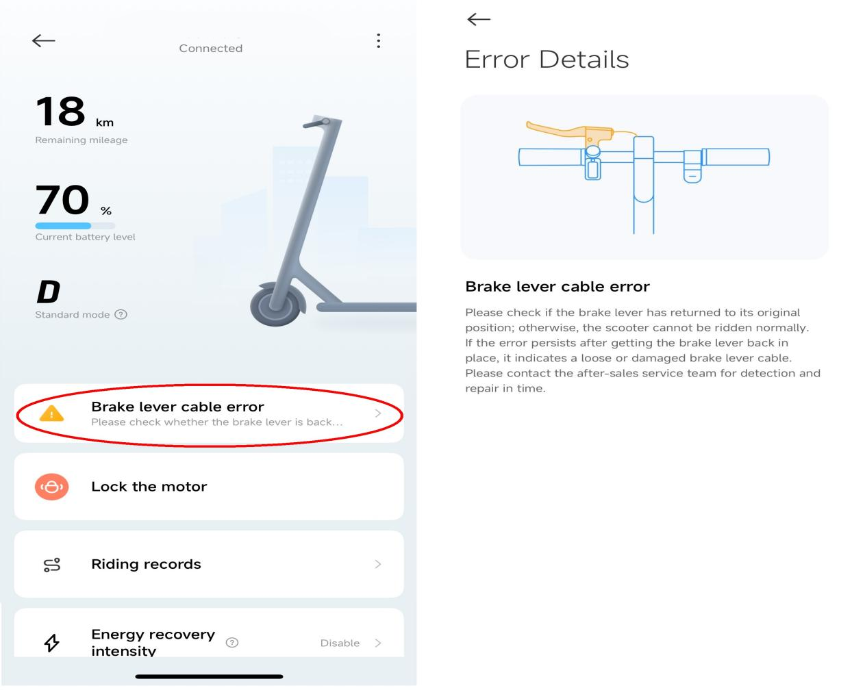 A: 전동 스쿠터에 이상이 발생하면 스쿠터의 조작 패널에 빨간색 깜박이는 렌치 아이콘이 표시되고, 속도계에는 빨간색으로 깜박이는 숫자(오류 코드)가 나타나며 “삐-삐-삐” 하는 소리가 동반됩니다. Xiaomi Home App 에 연결된 경우 스쿠터의 홈 페이지에도 오류 정보가 표시됩니다. 이 정보를 탭하면 아래 그림과 같이 고장의 상세 설명이 표시됩니다.
