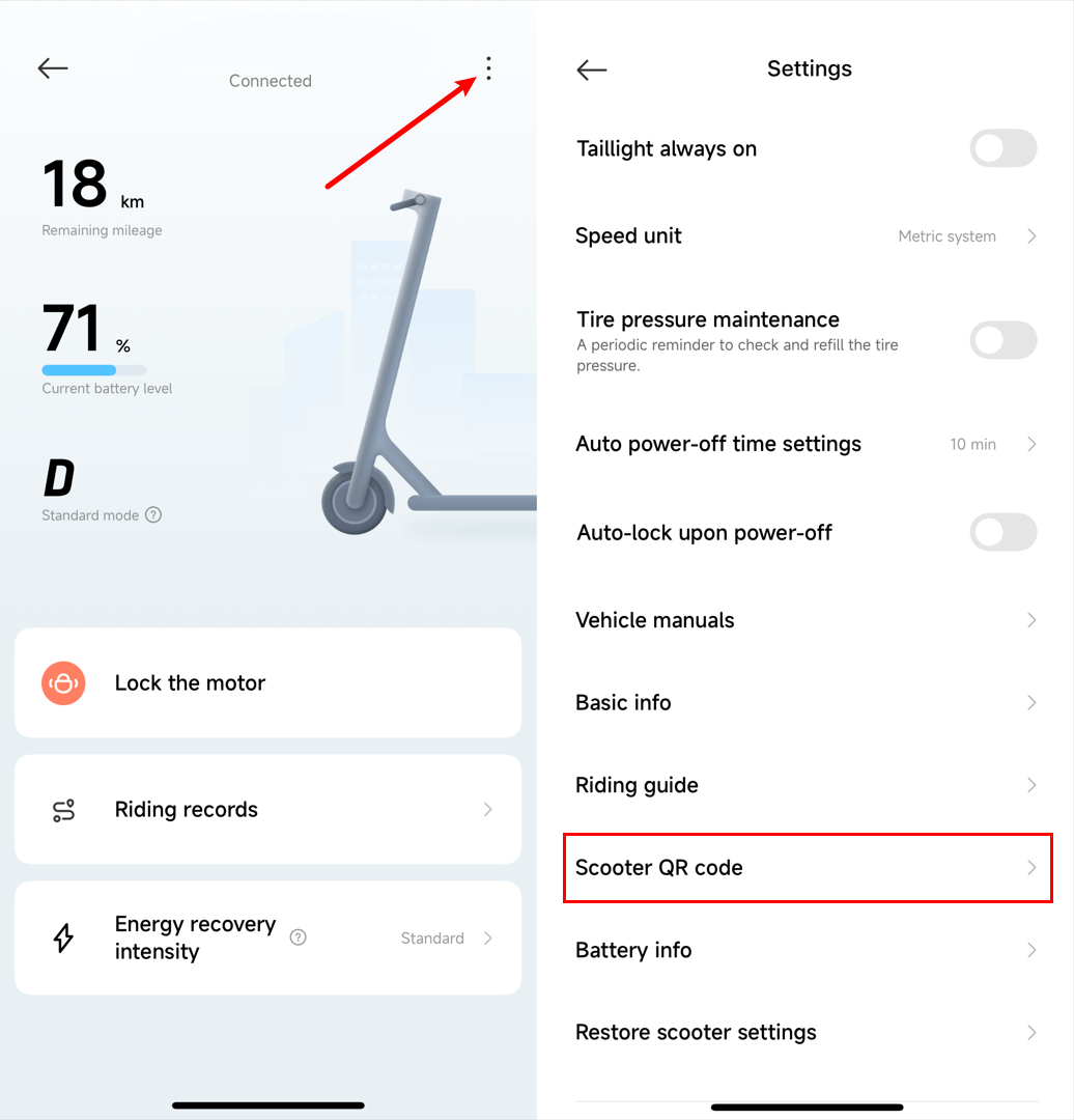 Q4: Xiaomi Electric Scooter 4 를 연결하기 위한 QR 코드 를 찾는 방법스쿠터 6 라이트?