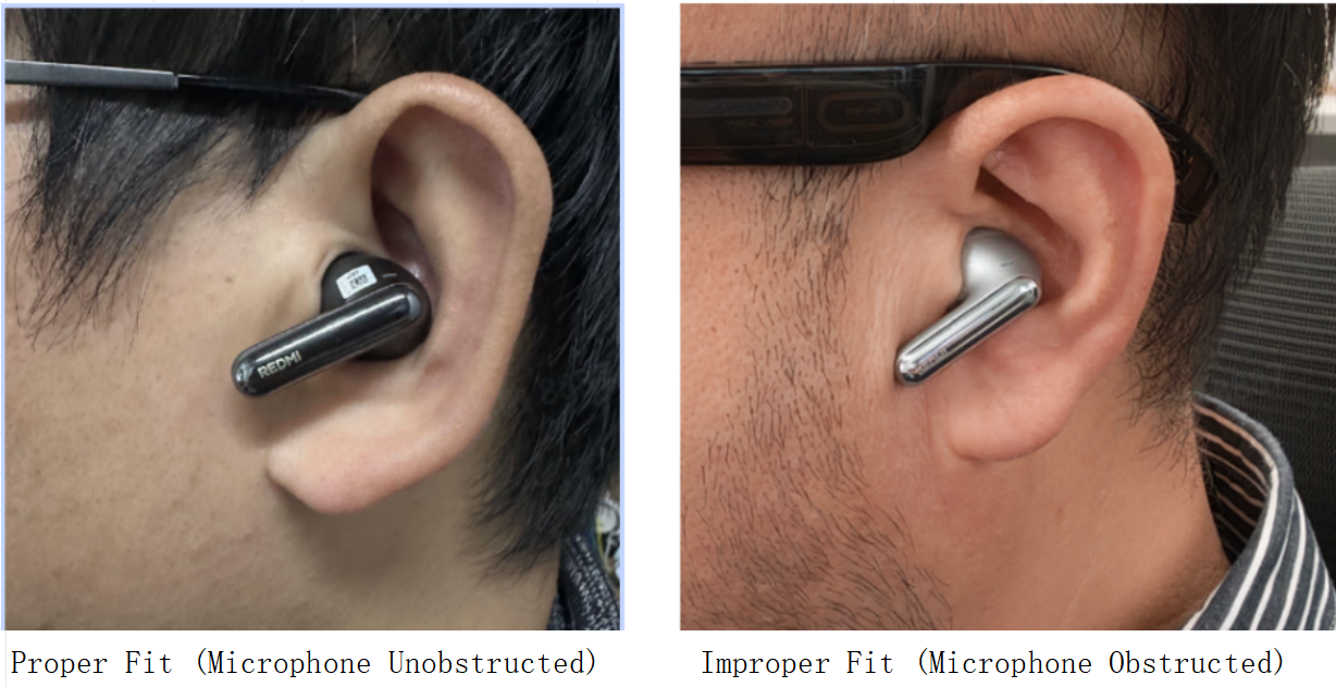 2. 때때로 이어버드 스템이 뺨을 누르면서 마이크 구멍을 막을 수 있습니다. 스템이 뺨에 닿지 않도록 착용 각도 또는 방향을 조정하면 이 문제를 해결할 수 있습니다.