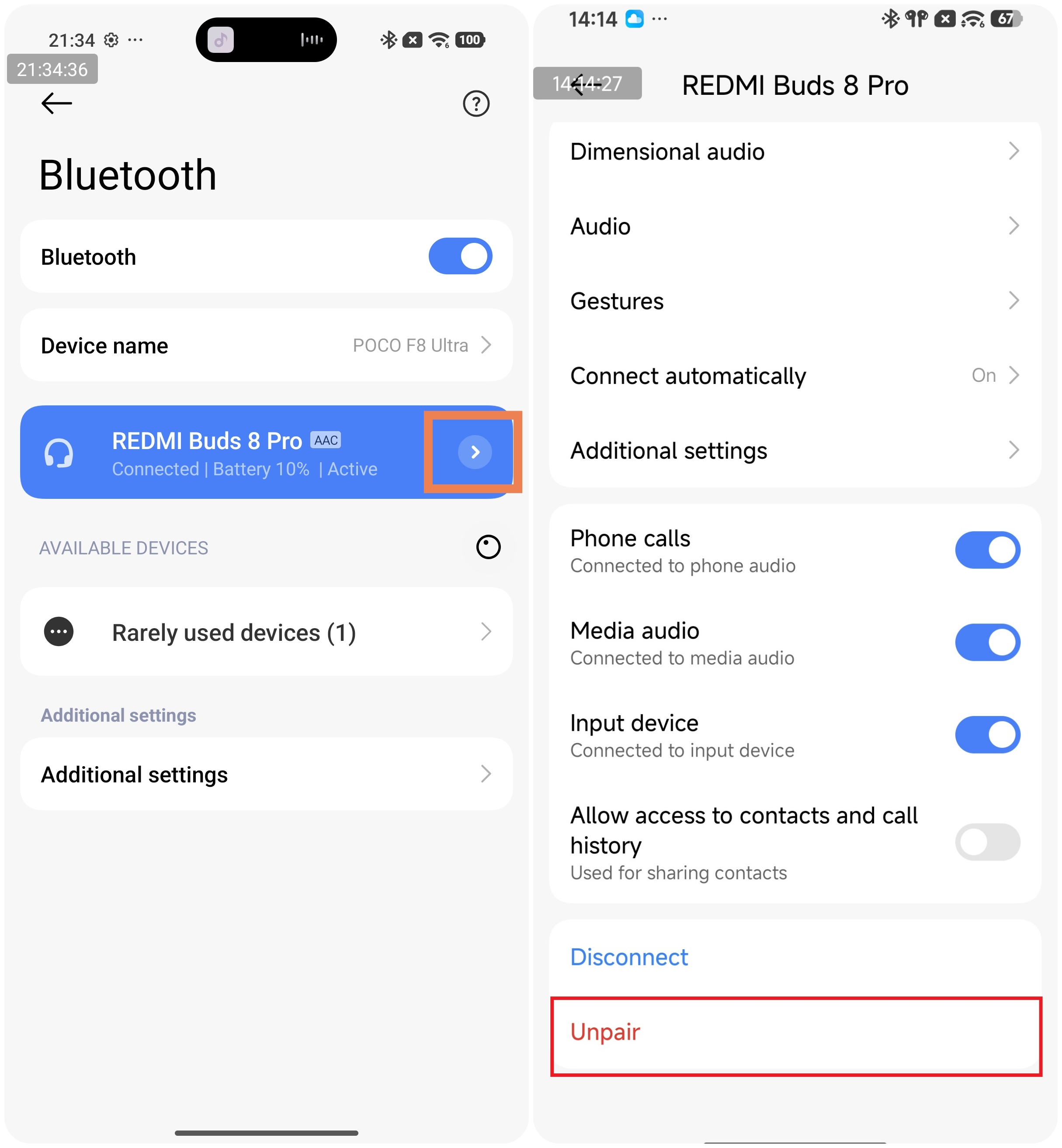 A:전화에서 REDMI Buds 8 Pro 의 연결을 해제하려면 다음 방법을 참고하십시오: