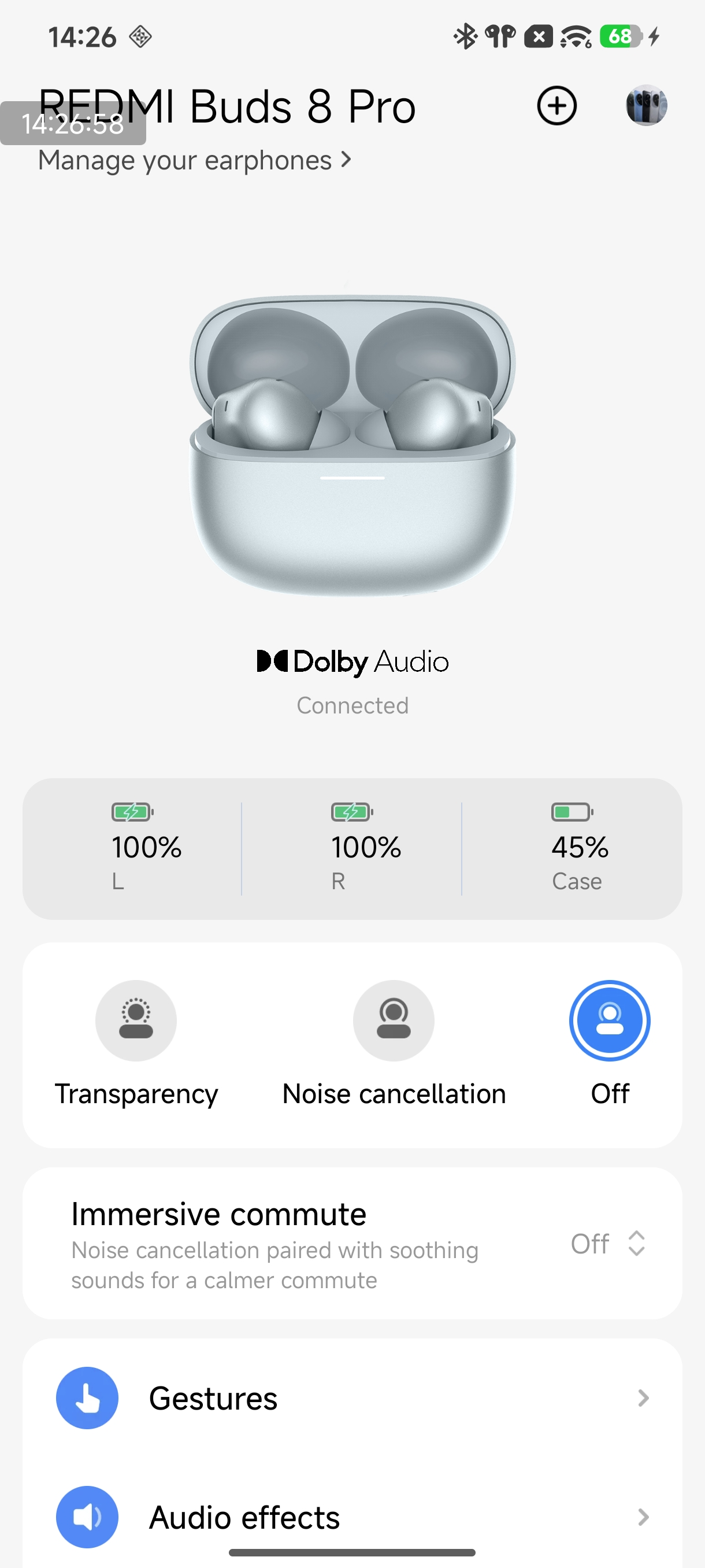 A: 샤오미 휴대폰에서 [설정] >> [블루투스] >> [REDMI Buds 8 Pro] 오른쪽의 [>] 아이콘을 탭한 다음 >> 이어버드를 착용하고 [몰입 통근]을 탭하세요 >> [비행기], [대중교통], [기차], [끄기] 중에서 선택하세요.