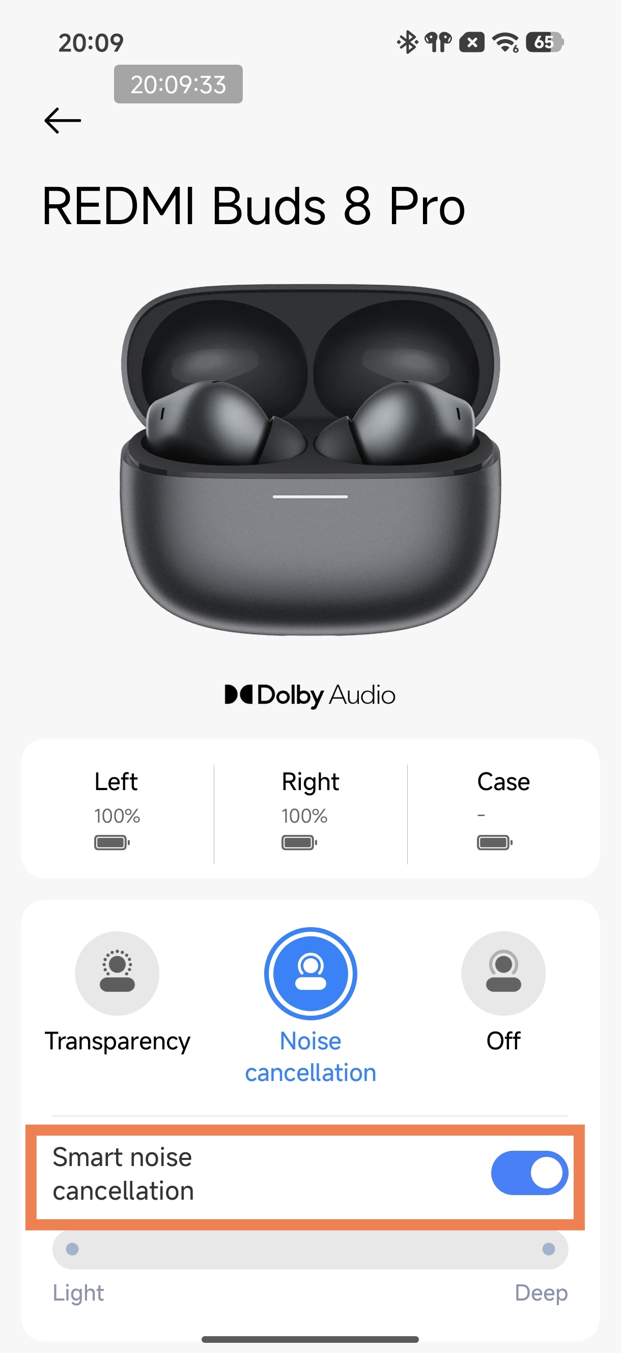 2. Xiaomi Earbuds App 에서 알맞은 소음 제거 수준을 수동으로 선택하거나 [스마트 소음 감소] 를 활성화하여 소음 감소 깊이에 자동으로 맞출 수 있습니다.