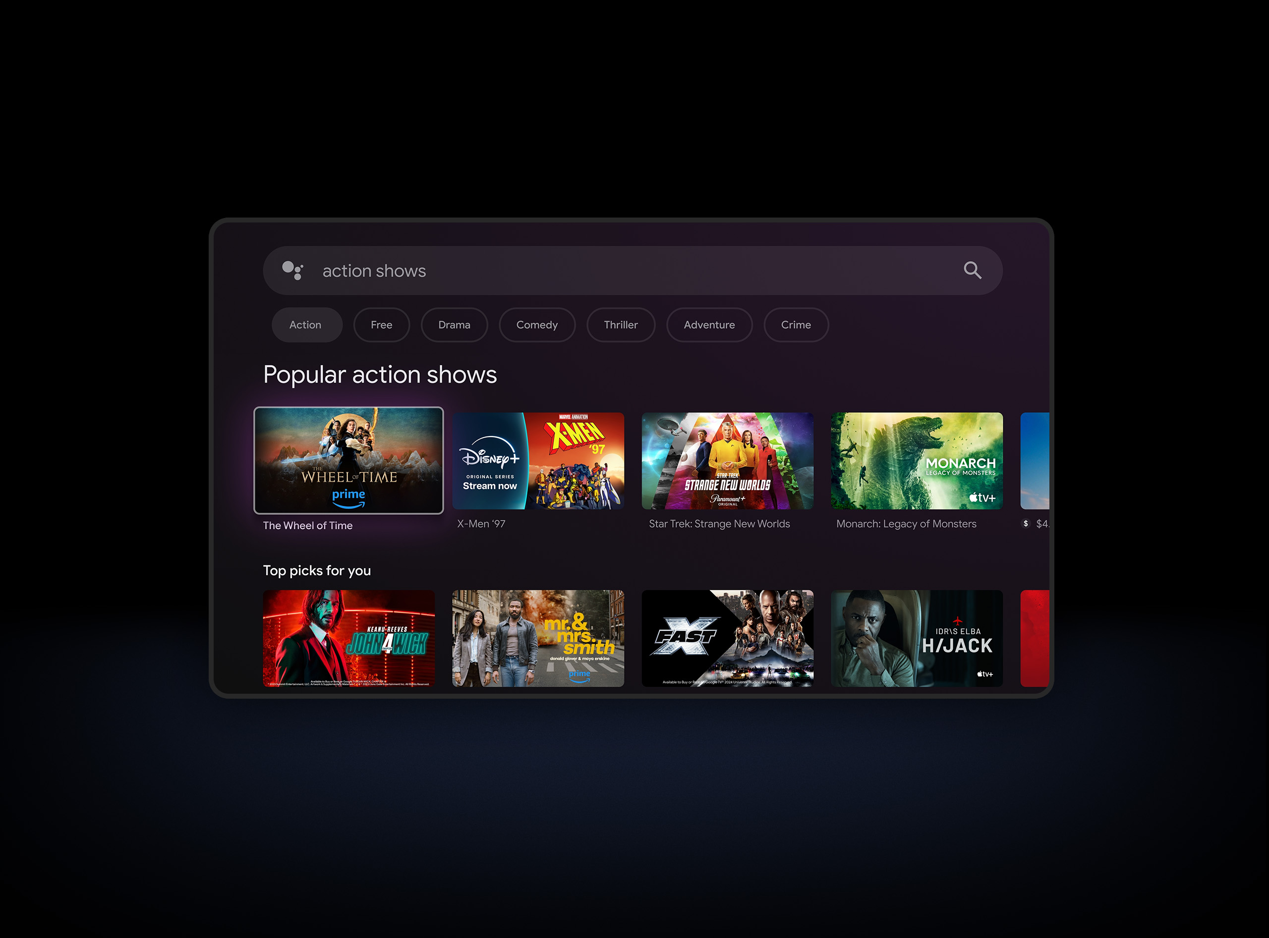 Теледидарыңыз бұрынғыдан да пайдалы. Google Assistant қызметінен фильмдерді табуды, қосымшаларды іске қосуды, музыка ойнатуды және теледидарды басқаруды дауыс арқылы сұраңыз. Тіпті осылай ақылды үй құрылғыларын да басқарып, сұрақтарға жауап ала аласыз. Бастау үшін қашықтан басқару пультіндегі Google Assistant түймесін басыңыз.*