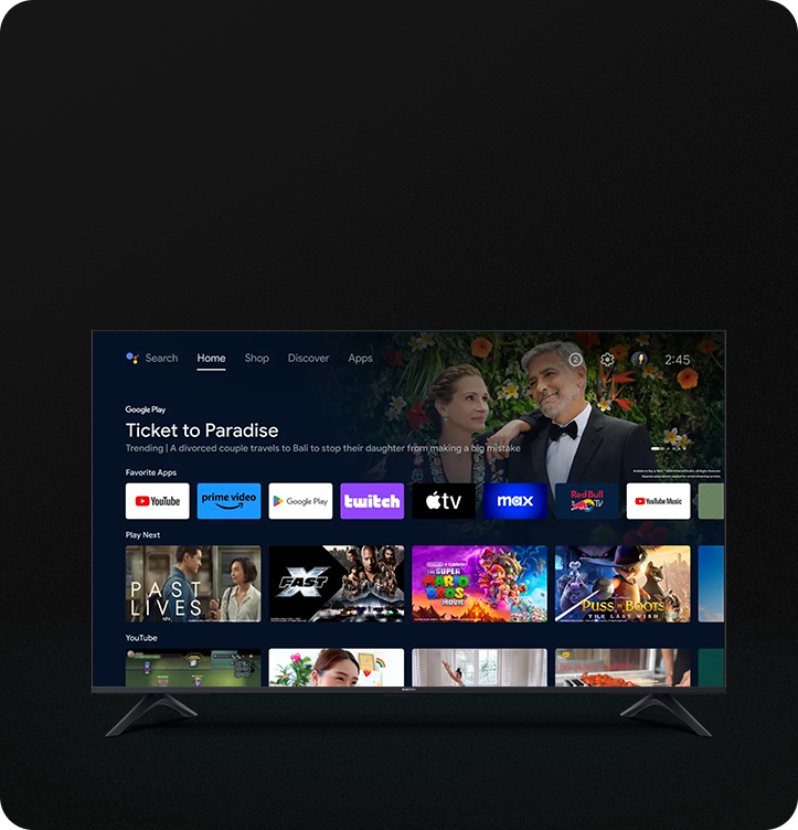 Выбирайте любимые фильмы и сериалы из более чем 400 000 или загружайте более 7000 приложений и игр, доступных в магазине Google Play*. Телевизор также может воспроизводить онлайн-видео с различных потоковых медиаплатформ, таких как Netflix, Prime Video и YouTube.