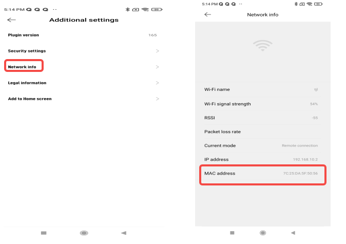 Xiaomi Home APP >> «...» >> көргіңіз келетін құрылғы. жоғарғы оң жақ бұрыштағы параметрлер >> Қосымша параметрлер >> желі ақпараты, суретте көрсетілгендей MAC мекенжайын көруге болады: