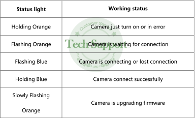 | 8 | ¿Por qué el dispositivo de visualización de la aplicación está fuera de línea? | 1. Compruebe si la fuente de alimentación de su cámara es normal. 2. Verifique el indicador de estado de la cámara: Luz naranja: encienda Parpadeo naranja: espere la conexión Luz azul intermitente: en conexión Luz azul: conexión exitosa Luz naranja: actualización de software en progreso Si algo sale mal con la red, la luz azul sigue parpadeando. Compruebe si la red WiFi es normal. Si hay otros problemas, intente reiniciar la máquina y vuelva a conectar la cámara. |