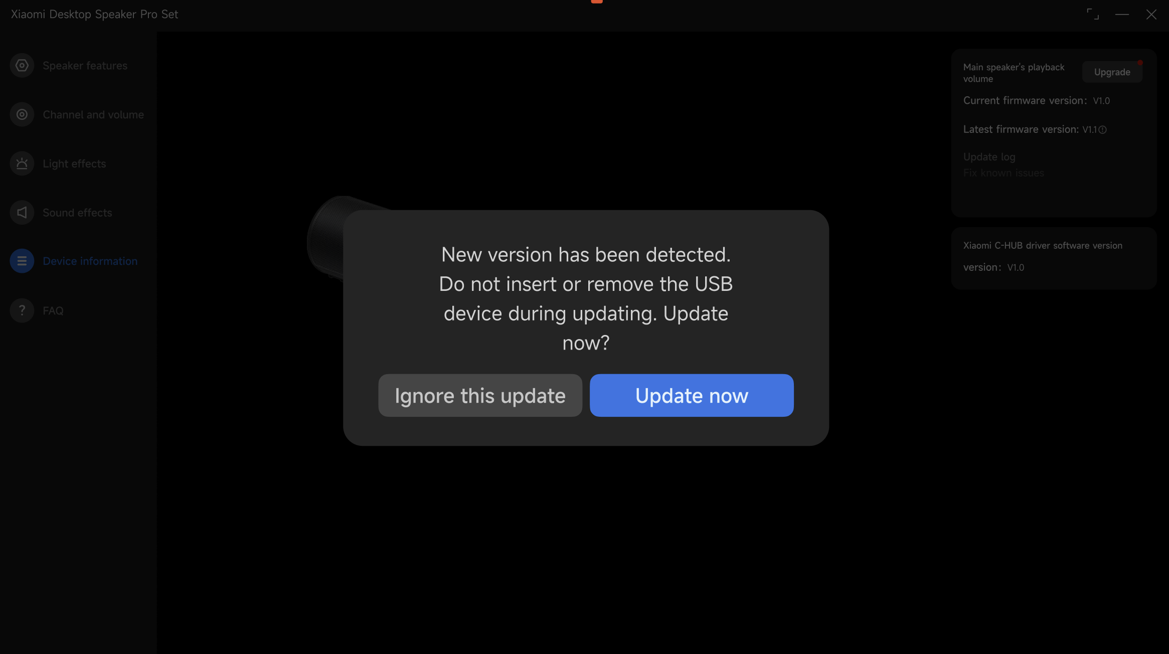 Inicia Xiaomi C-HUB en tu computadora. Después de iniciarse, la aplicación comprobará automáticamente la versión actual del firmware de Xiaomi Desktop Speaker Pro Set. Si hay disponible una nueva versión de firmware, aparecerá automáticamente una ventana con el aviso de actualización. Haz clic en "Actualizar ahora" para iniciar el proceso de actualización.