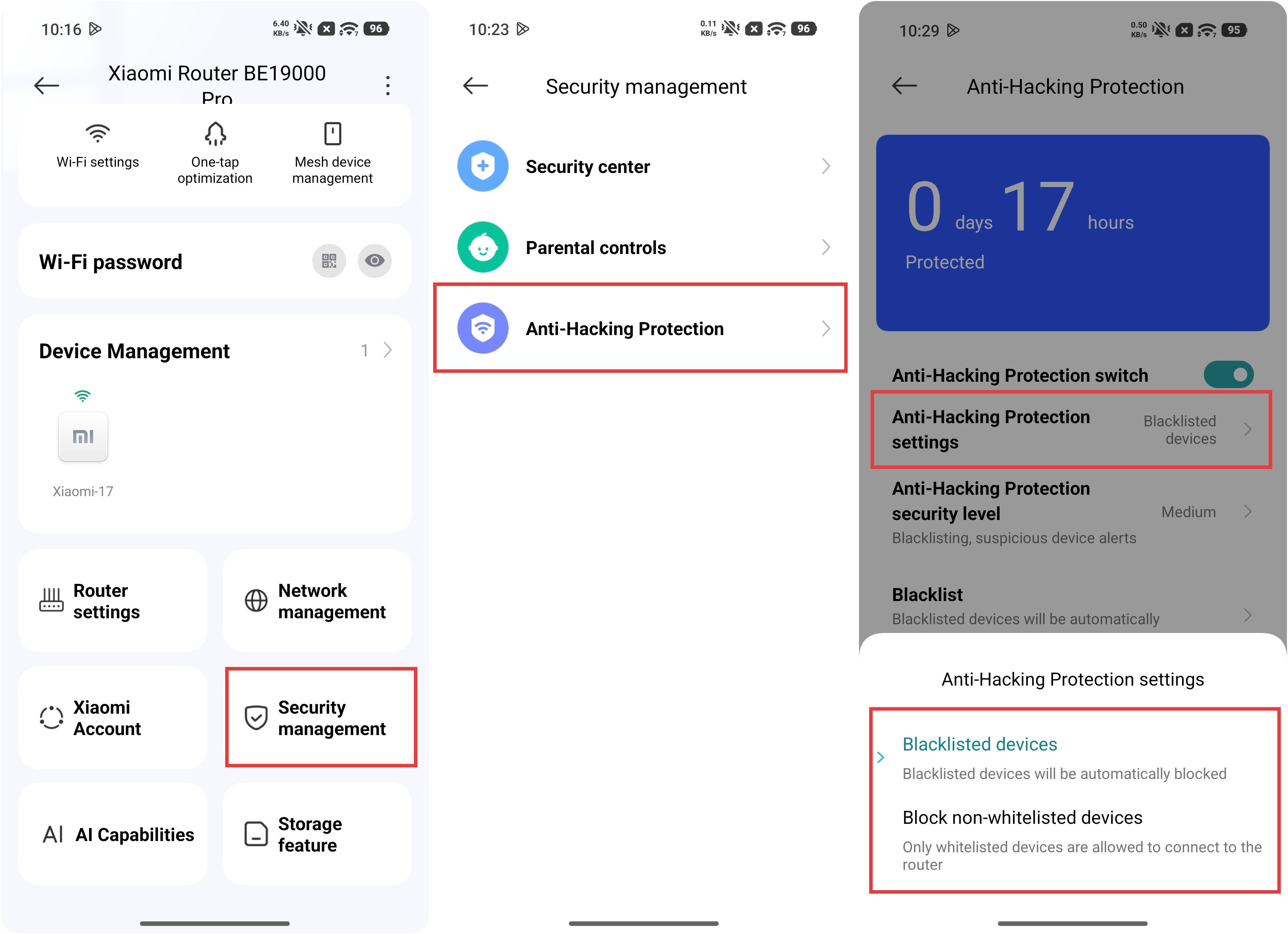 R: Para limitar la cantidad de dispositivos que acceden a Wi-Fi en el Xiaomi Router BE19000 Pro, puedes ir a la Xiaomi Home App >> seleccionar la tarjeta Xiaomi Router BE19000 Pro >> [Gestión de seguridad] >> [Protección contra hackeos] para configurar la lista negra o la lista blanca y limitar los dispositivos que acceden a Wi-Fi.