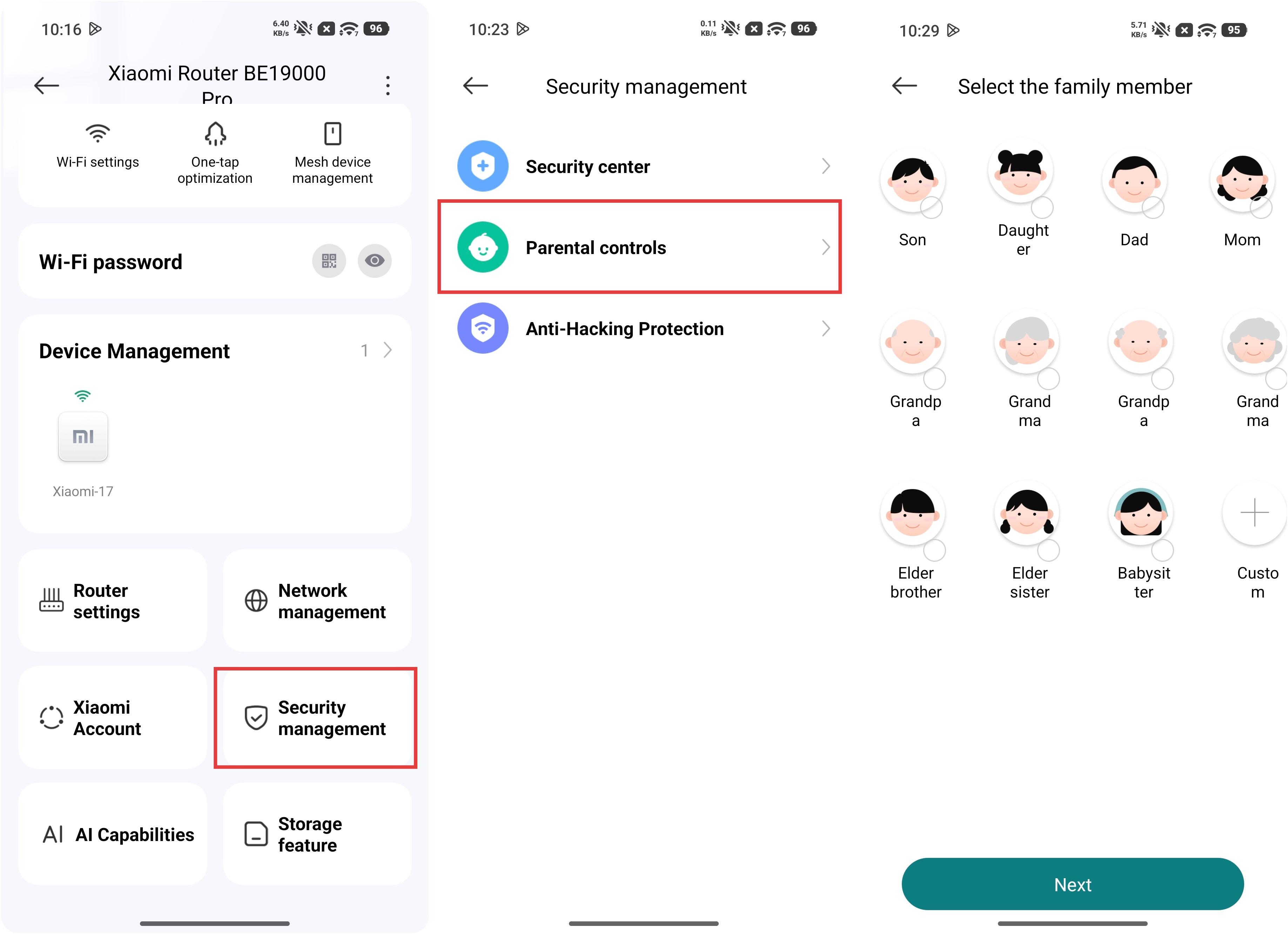R: Para configurar la función de controles parentales en el Xiaomi Router BE19000 Pro, puedes ir a la Xiaomi Home App >> seleccionar la tarjeta Xiaomi Router BE19000 Pro >> [Gestión de seguridad] >> [Controles parentales] para seleccionar al miembro de la familia.