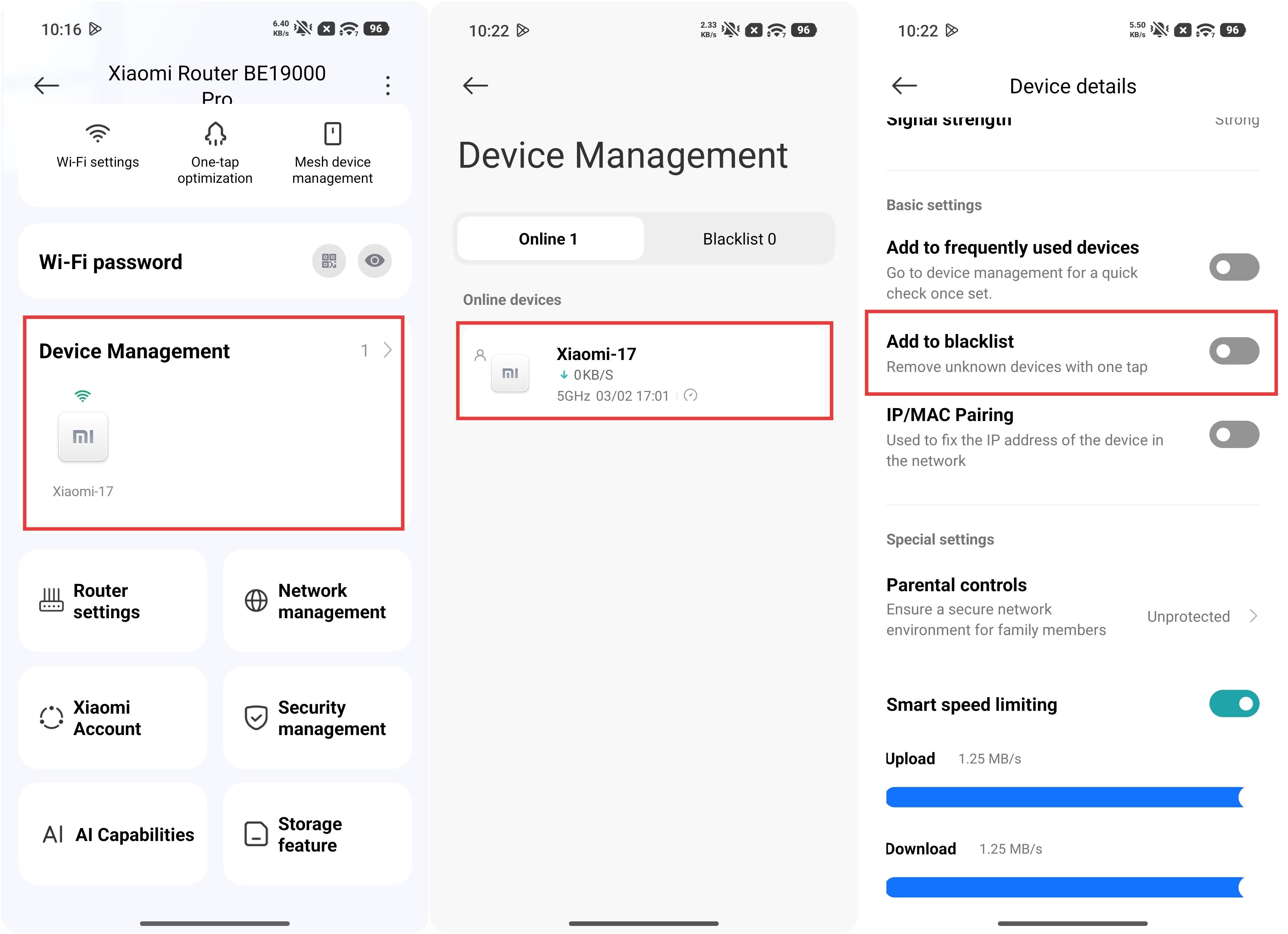 También puedes ir a la Xiaomi Home App >> seleccionar la tarjeta Xiaomi Router BE19000 Pro >> entrar en la interfaz de [Gestión de dispositivos] >> seleccionar el dispositivo que quieres añadir a la lista negra >> activar [Añadir a la lista negra].