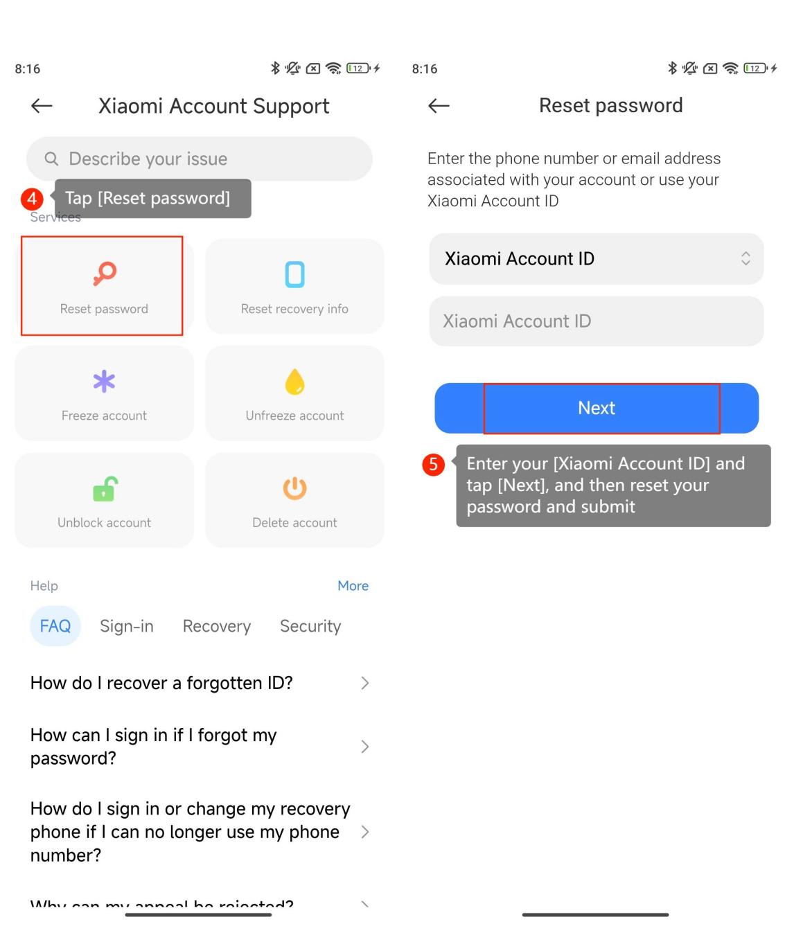 5. Introduce tu [ID de cuenta Xiaomi] o [tu número de teléfono] o [número de correo electrónico] asociado a tu cuenta y toca [Siguiente]. A continuación, puede restablecer su contraseña y enviarla.
