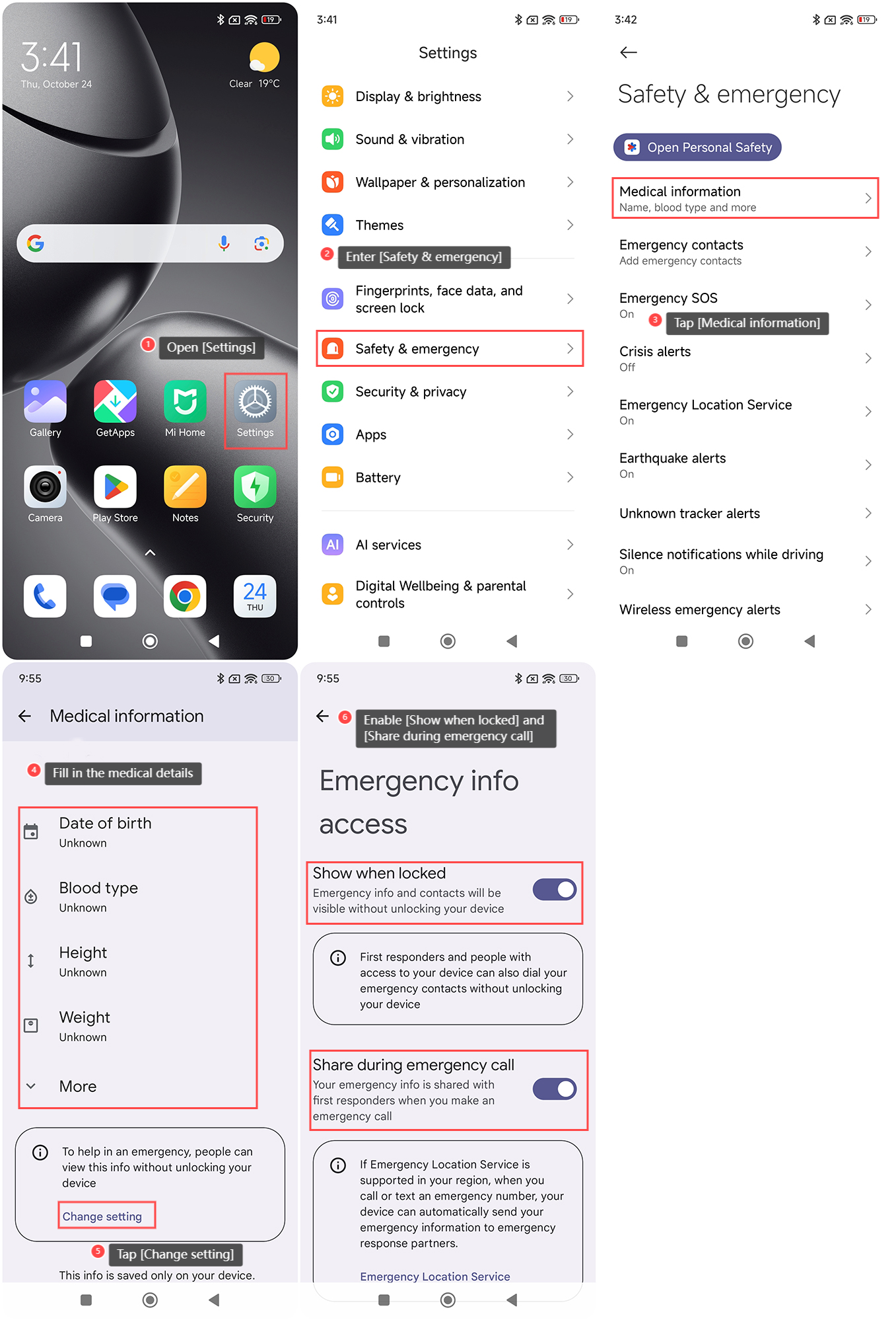 Rellenar la información médica del Xiaomi 14T garantiza que los detalles críticos de salud, como alergias, afecciones médicas y más, estén disponibles para los socorristas. Esto mejora la seguridad en emergencias, proporcionando un acceso rápido a información vital incluso si el dispositivo está bloqueado.