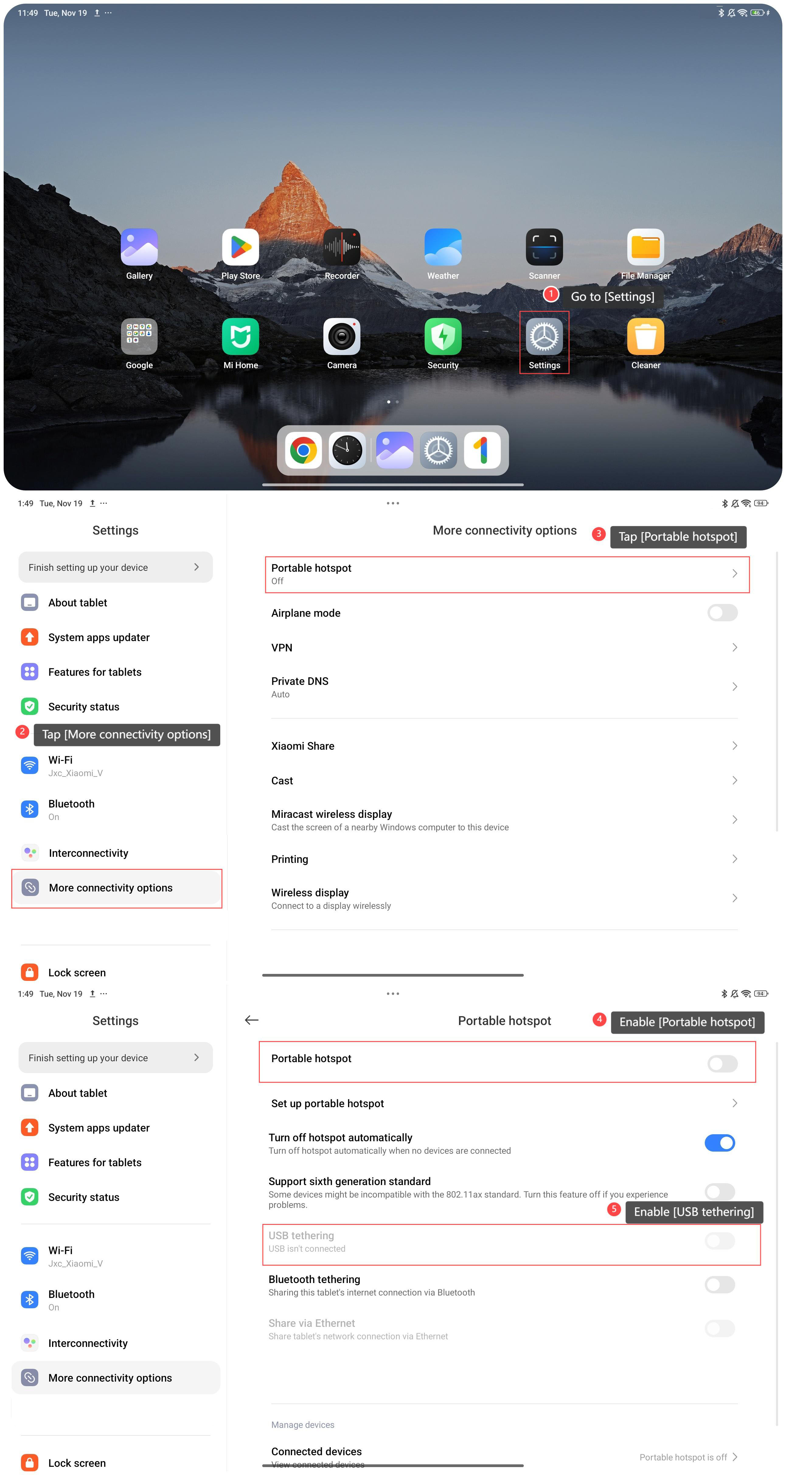 Para compartir el punto de acceso de su tableta a través de USB, consulte los siguientes pasos: