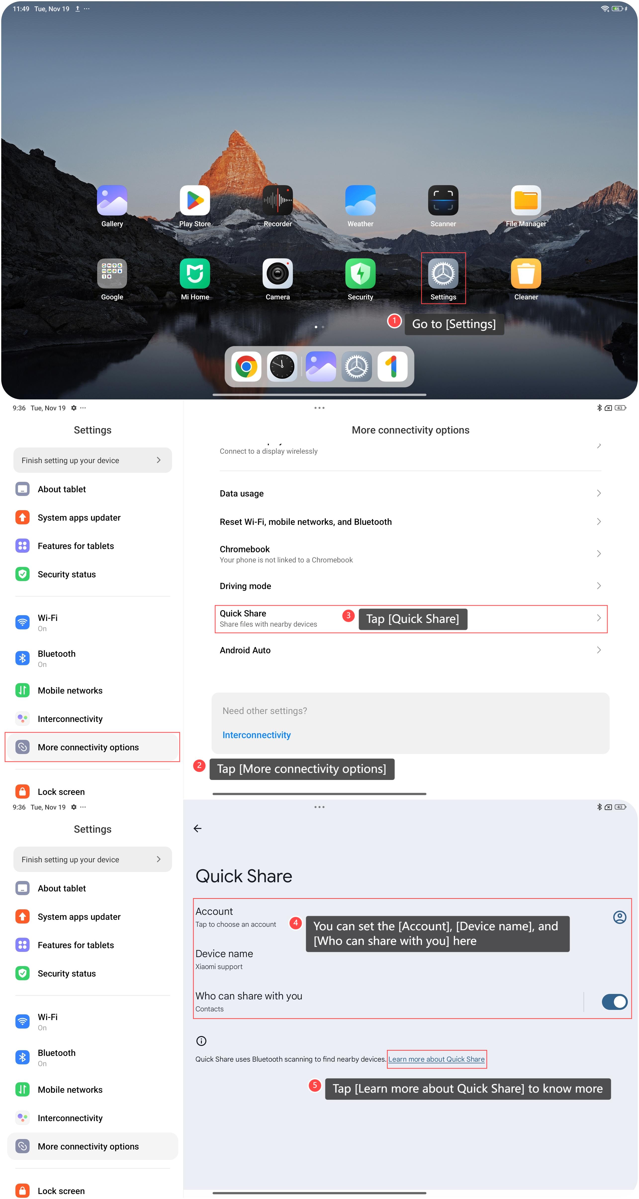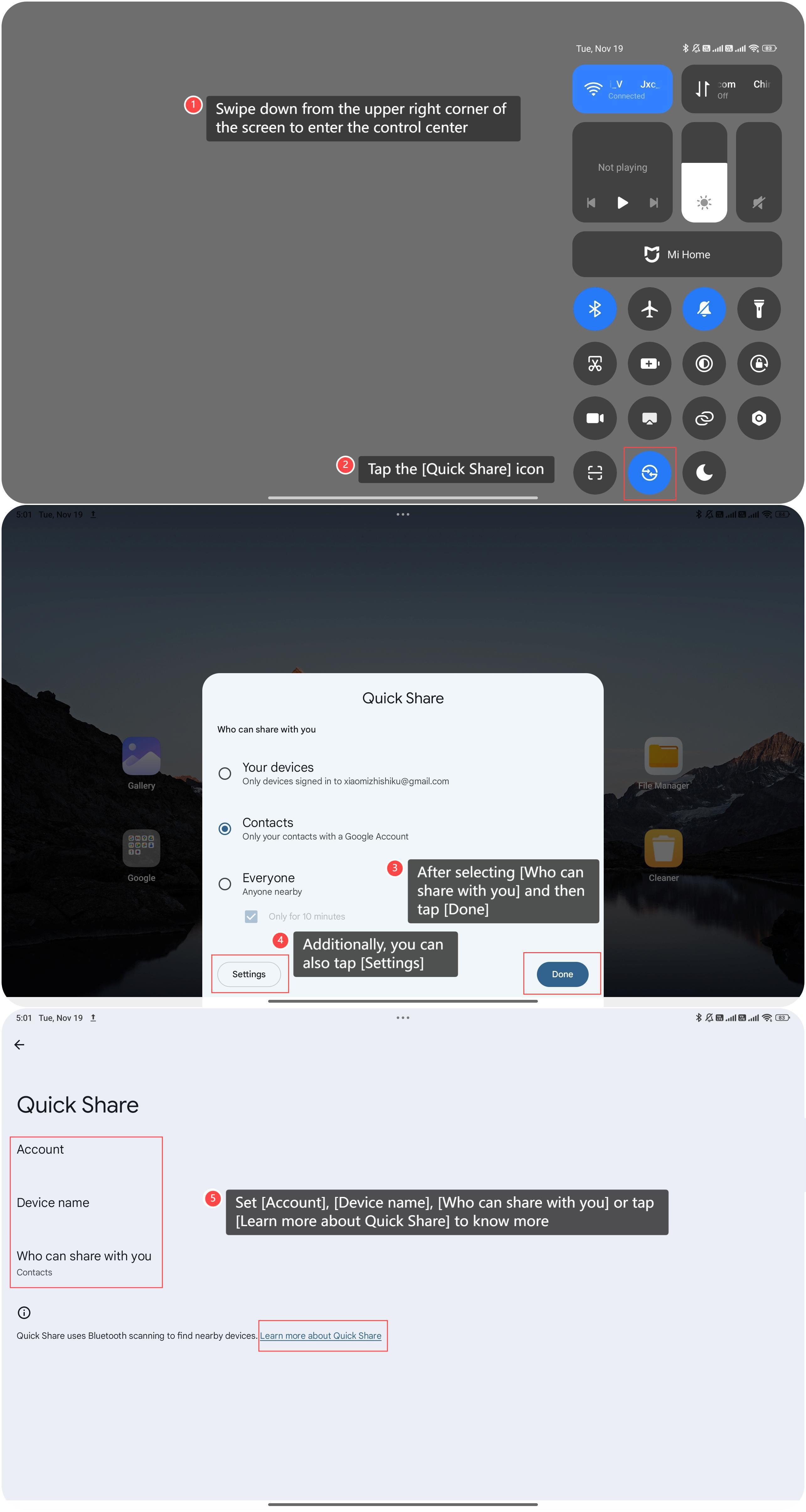 5. Configura [Cuenta]", [Nombre del dispositivo], [Quién puede compartir contigo] o toca [Más información sobre Quick Share] para obtener más información.