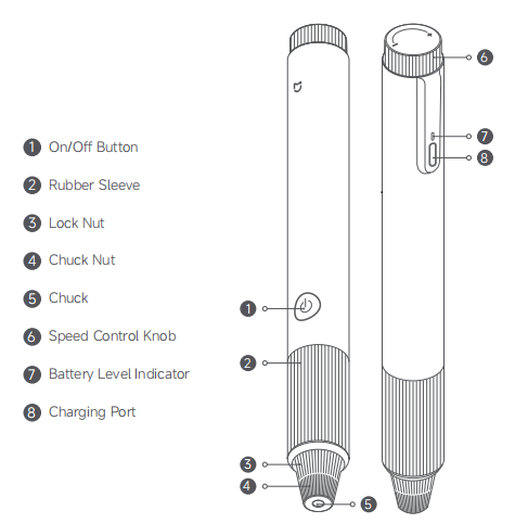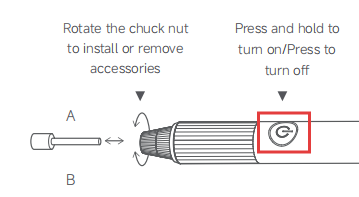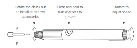 R: Después de acoplar un accesorio compatible, pulsa el botón de encendido para poner en marcha el Mijia Rotary Tool Kit. Mientras la herramienta está en funcionamiento, puedes ajustar la velocidad de rotación de forma continua mediante la perilla de control de velocidad.