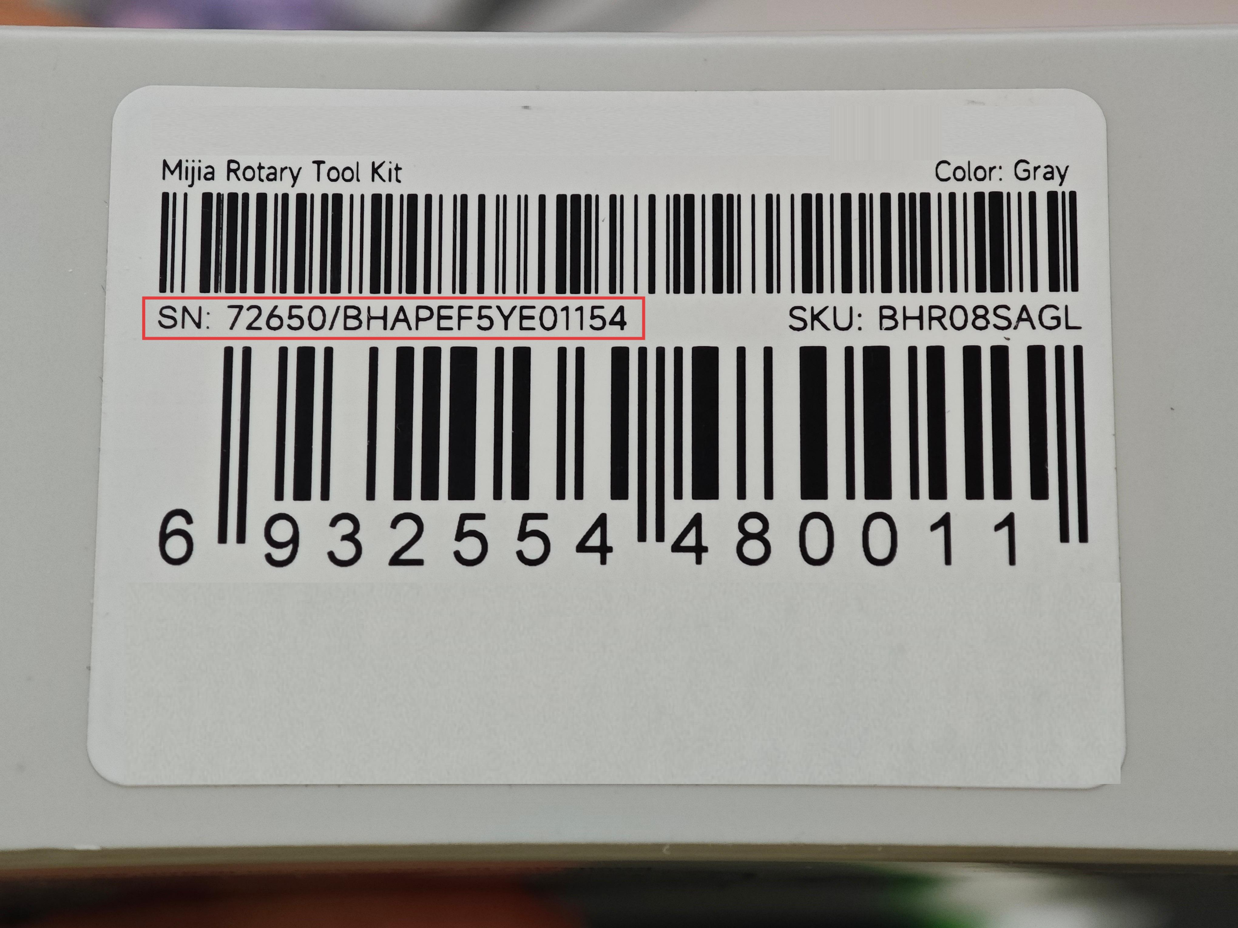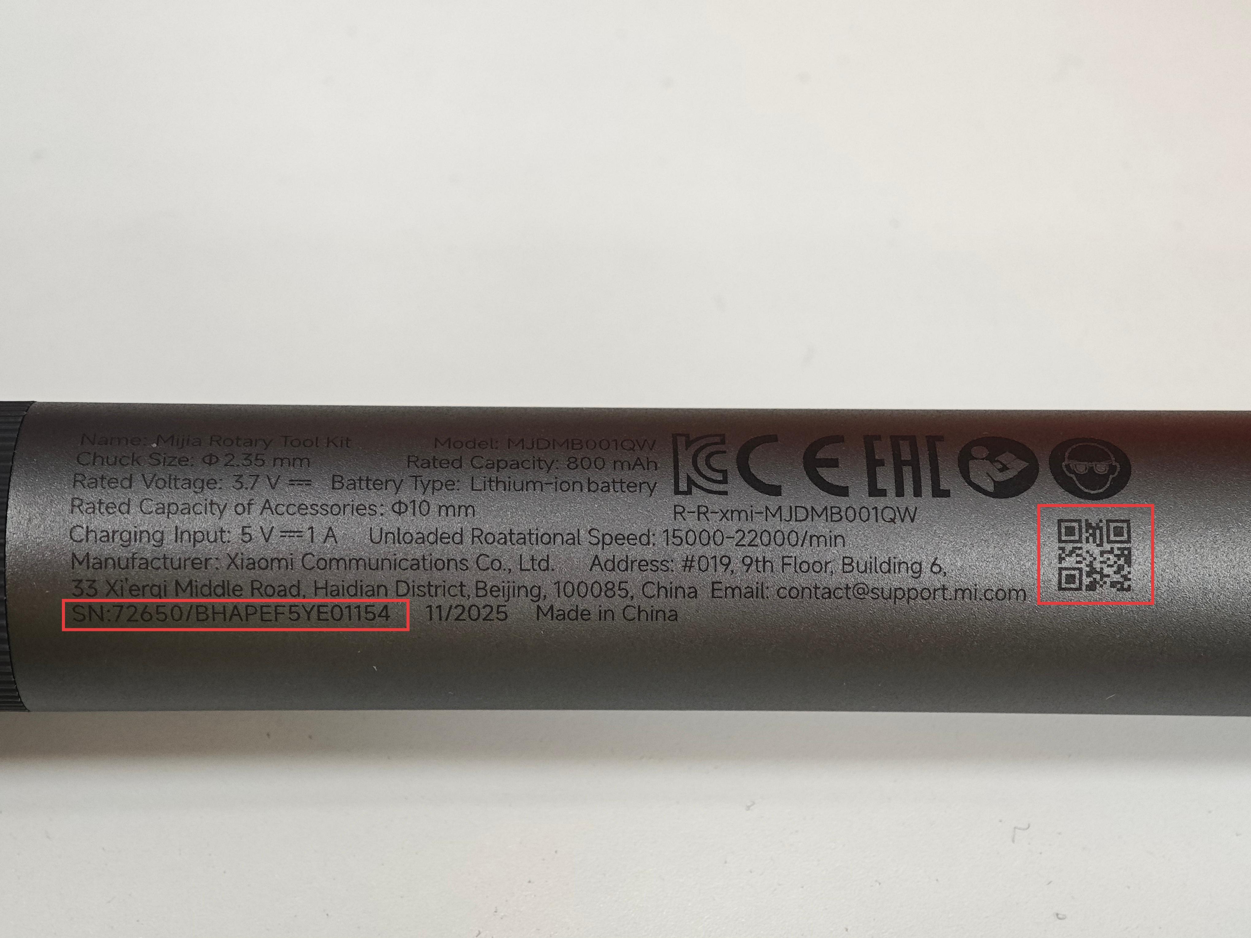 2. El cuerpo del producto también tiene un número de serie impreso. Y el SN está en forma de un código QR, grabado con láser en la carcasa exterior del Mijia Rotary Tool Kit, puedes escanearlo usando la Scanner App en tu dispositivo.