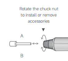 R: Si es necesario girar el portabrocas en el Mijia Rotary Tool Kit, sujete la tuerca de bloqueo con la mano y gire la tuerca del portabrocas para sustituir o retirar el portabrocas.