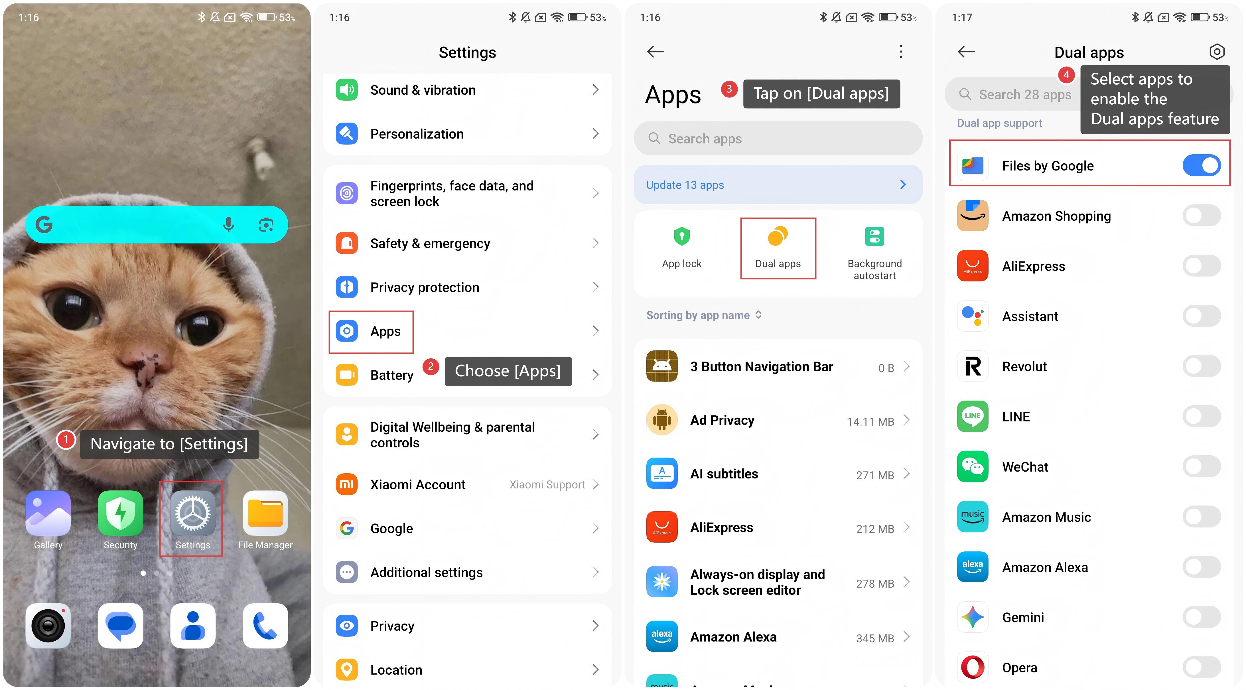 To enable Dual apps on the Redmi Note 13, please refer to the following steps: