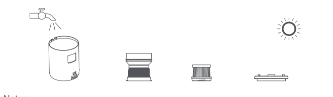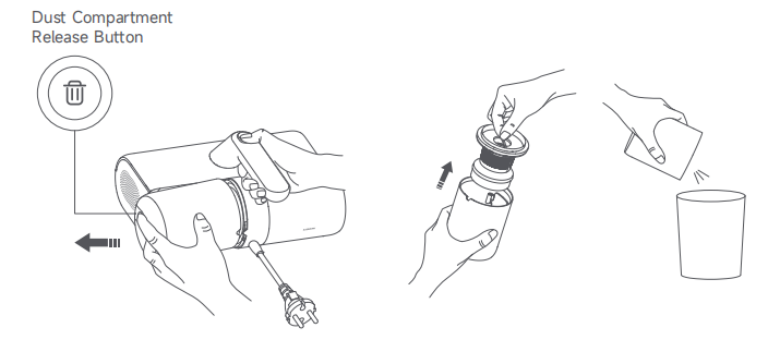 The steps to clean the dust compartment are as follows: 1. Press and hold the Dust Compartment Release Button and simultaneously pull it backward to remove the dust compartment assembly; 2. Above the trash can, lift the cyclone separator assembly, pour out the garbage in the dust compartment, and clean the dust on the surface of the cyclone separator assembly; 3. After cleaning the garbage, install the cyclone separator assembly back into the dust compartment; 4. Align the triangular notch of the dust compartment assembly with the triangular protrusion on the dust mite vacuum cleaner, then push the dust compartment assembly into the vacuum cleaner. It is properly installed when you hear a "click". If suction decreases, wash the dust compartment assembly promptly to regain the mite removal performance and prevent blockage from the air duct that causes the dust mite vacuum cleaner to shut down. Here are the steps to wash the dust compartment: 1. Remove the dust compartment assembly, and take out the cyclone separator assembly. Hold the Filter Bracket and rotate the cyclone separator counterclockwise to remove it; 2. Rotate the filter counterclockwise to remove it; 3. Clean the surfaces of the dust compartment, cyclone separator, filter, and filter bracket, rinse them with clean tap water, and then air-dry them thoroughly; 4. After cleaning and fully drying, reinstall the filter and cyclone separator into the filter bracket clockwise in order. Then place the cyclone separator assembly into the dust compartment and press it firmly; 5. Reinstall the dust compartment assembly back into the dust mite vacuum cleaner. Note: 1. It is recommended to wash and clean the filter every 5-6 times of vacuuming, or you can change the cleaning frequency as needed; 2. It is recommended to replace the filter every 2-3 months to ensure optimal vacuuming performance; 3. Rinse the filter and the air inlet filter cotton with clean water. To prevent damage, do not rub, scrub, or wash them with your hands or any sharp objects such as brushes; 4. After rinsing, be sure to thoroughly air-dry the components (away from direct sunlight) before re-installation. To clean the suction inlets on the device, please refer to the following steps: 1. Remove the dust compartment assembly and flip the dust mite vacuum cleaner. There are two suction inlets: one at the bottom and the other one on the dust compartment; 2. Use a dry cloth or tissue to clean the dust from these inlets. Note: 1. It is normal for dust and other particles to adhere to the two suction inlets. Please clean them regularly; 2. The function of the air inlet filter cotton is filtration. Please do not discard it.
