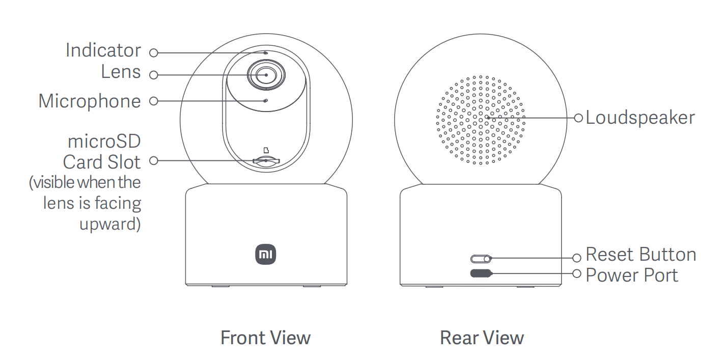 The appearance of the Xiaomi Smart Camera C301 is introduced as follows: 1. In the front view, there arean Indicator, a Lens, a Microphone, and a microSD Card Slot (It is visible when the lens is facing upward); 2. In the rear view,there are a Loudspeaker, a Reset Button and a Power Port. Note: 1. The camera supports the physical lens blocking feature to enhance privacy protection; 2. The product’s nameplate information is on the bottom and side of the product. You can check the SN (product unique identification number) from the bottom of the camera as well as from the back of the product packaging.
