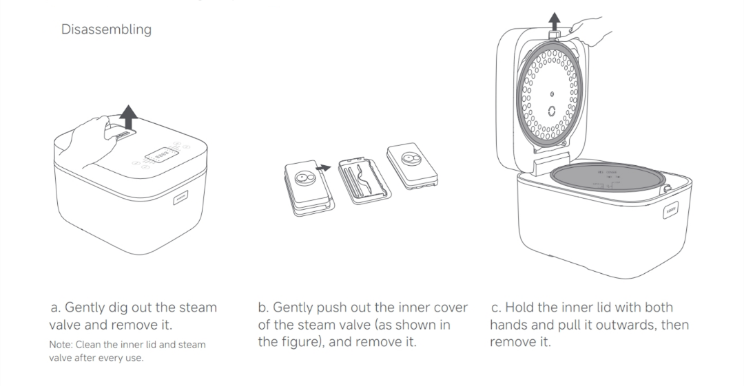 To install the steam valve and inner lid, please check the following steps: 1. Align and push the inner cover onto the steam valve to assemble it; 2. Align the steam valve hole on the steam valve with the steam outlet and install the steam valve; 3. Align the inner lid to the latch and gently push the inner lid into it. When you hear a click sound, the buckle is locked firmly. Note: The inner lid must be installed, otherwise the upper lid of the rice cooker cannot be closed. To remove the steam valve, please check the following steps: 1. Gently dig out the steam valve and remove it. To remove the inner lid, please check the following steps: 1. Open the upper lid of the rice cooker, push out the inner cover of the steam valve, and remove it; 2. Hold the inner lid with both hands and pull it outwards, and then remove it. Note: It is recommended to clean the inner lid and steam valve after each cooking.