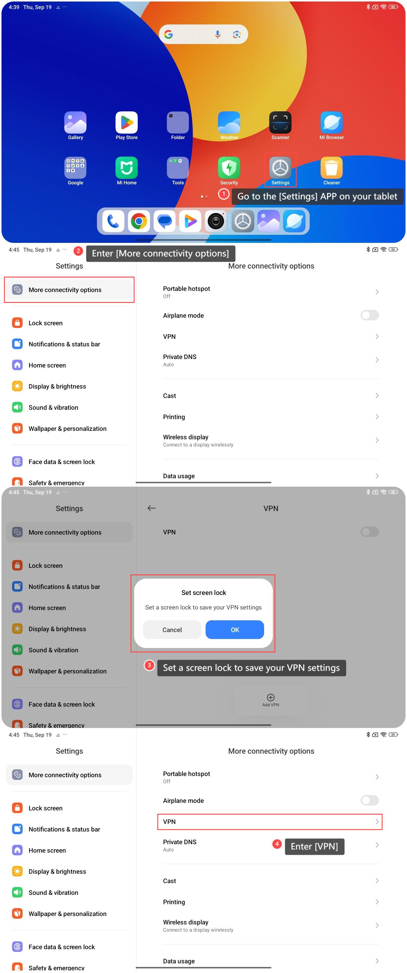 Setting up a VPN on the Redmi Pad SE 8.7 4G helps protect your online privacy by encrypting your internet connection, securing sensitive data, and allowing access to region-restricted content. This enhances both security and flexibility while browsing the internet. To set up a VPN on your tablet, please refer to the following steps: 1. Go to the [Settings] APP on your tablet; 2. Enter [More connectivity options]; 3. You need to set a screen lock to save your VPN settings; 4. Enter[VPN]; 5. Tap [Add VPN]; 6. Enter the required information, such as the VPN name, type, server address, and any authentication details provided by your VPN service; 7. After entering all the necessary details, tap the [√] icon at the upper right corner to save the information; 8. Go back to the VPN list and select the VPN and turn on the switch. Note: Once the VPN has connected, you will see a VPN icon in the status bar, indicating that your VPN is active.