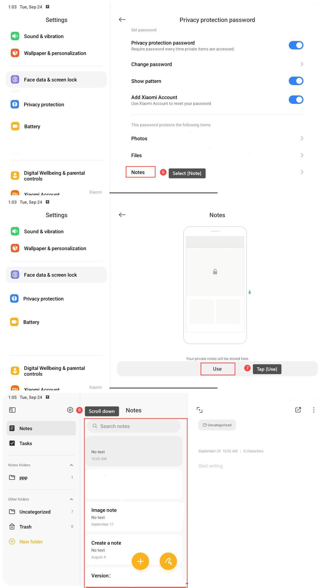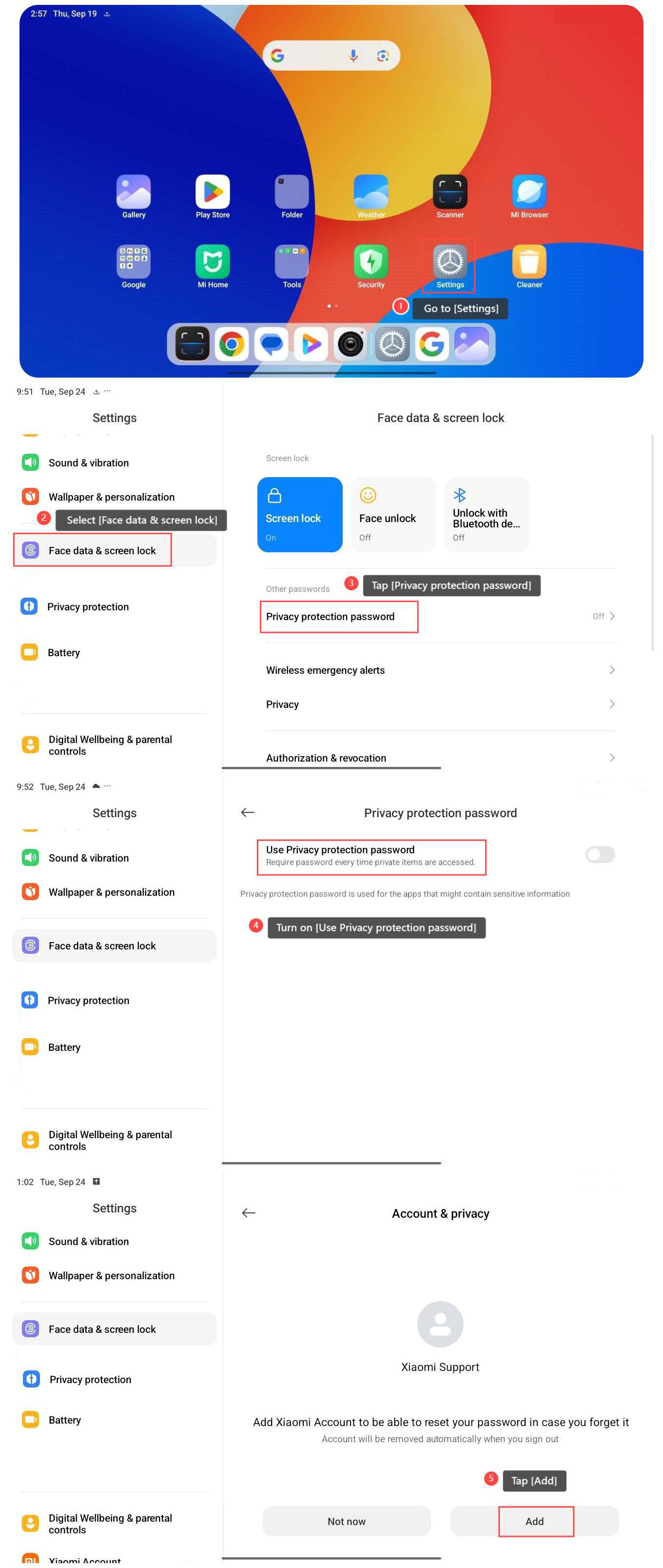 Private notes on the Redmi Pad SE 8.7 is a secure feature for creating and storing notes that are accessible only to you. These notes can be protected with a Privacy protection password, helping to keep sensitive information safe. You can use this feature for personal reminders, sensitive information, or anything you want to keep confidential. To make and check the private notes, please refer to the following steps: 1. Go to [Settings]; 2. Select [Face data & screen lock]; 3. Tap [Privacy protection password]; 4. Turn on [Use Privacy protection password], and you will follow the prompts to input your password, confirming it as needed. 5. Tap [Add];