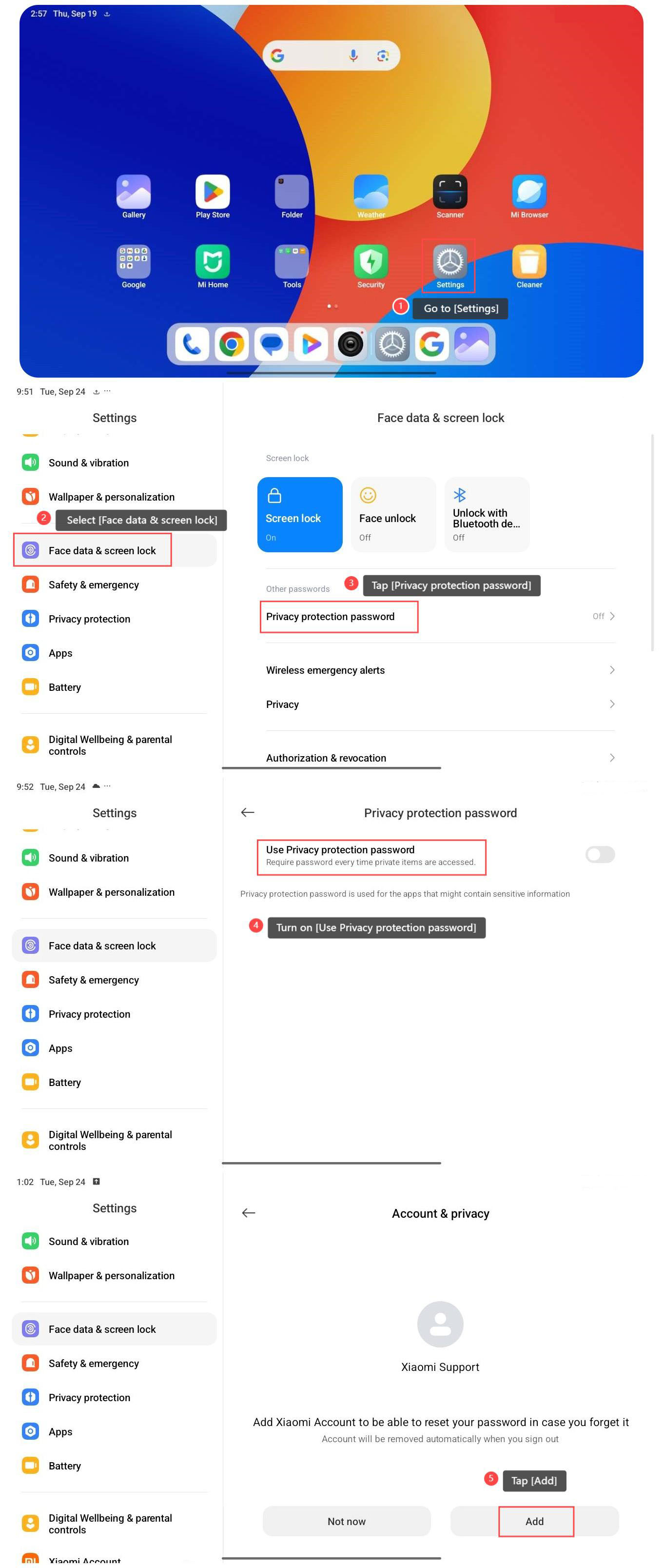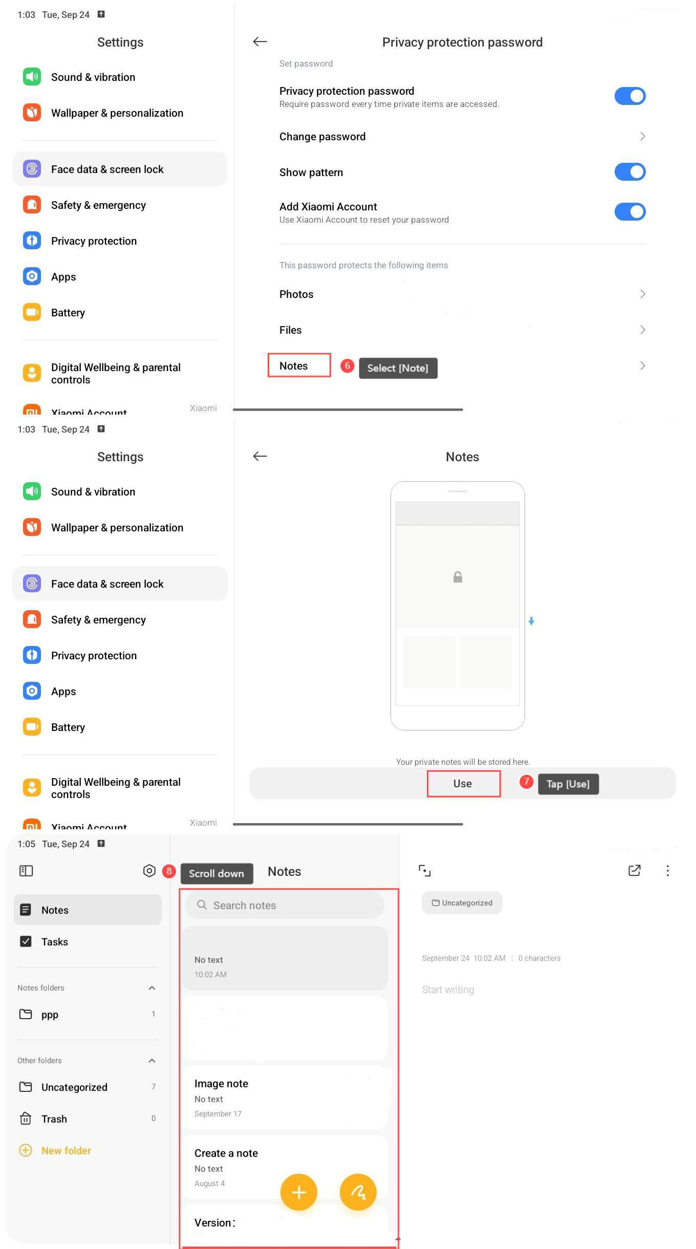 Private notes on the Redmi Pad SE 8.7 4G is a secure feature for creating and storing notes that are accessible only to you. These notes can be protected with a Privacy protection password, helping to keep sensitive information safe. You can use this feature for personal reminders, sensitive information, or anything you want to keep confidential. To make and check the private notes, please refer to the following steps: 1. Go to [Settings]; 2. Select [Face data & screen lock]; 3. Tap [Privacy protection password]; 4. Turn on [Use Privacy protection password], and you will follow the prompts to input your password, confirming it as needed. 5. Tap [Add];