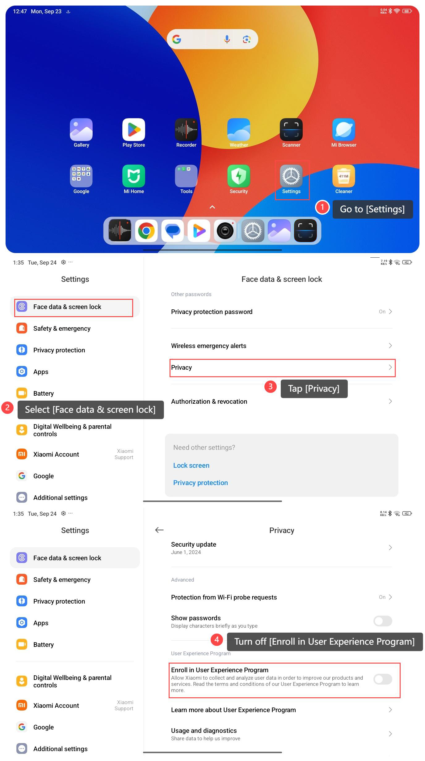 Turning off the function of Enroll in User Experience Program on the Redmi Pad SE 8.7 will stop Xiaomi from collecting and analyzing your data. To turn off User Experience Program on your tablet,please refer to the following steps: 1. Go to [Settings]; 2. Select [Face data & screen lock]; 3. Tap[Privacy]; 4. Turn off [Enroll in User Experience Program]. Note: 1. Turning off this feature can increase your privacy by limiting the information shared with Xiaomi regarding how the device is used; 2. Minimizes any related notifications or prompts that can arise from being part of the program; 3. Potentially enhances performance by limiting background processes associated with data collection, which can save power and improve responsiveness; 4. Reduces the consumption of network data and system resources, which can be beneficial for you with limited data plans.