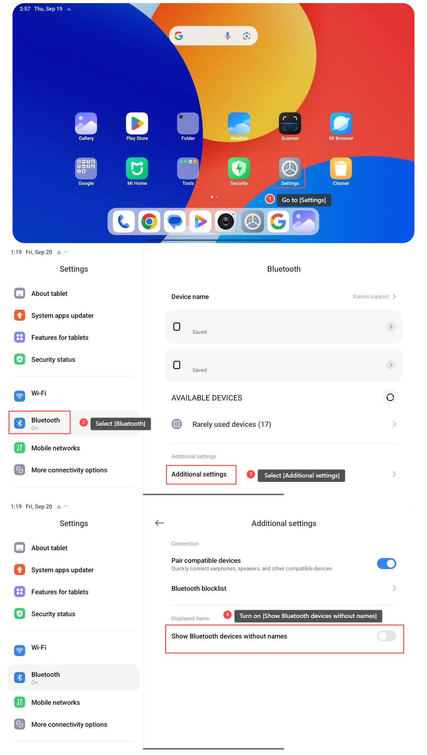 Bluetooth devices without names on the Redmi Pad SE 8.7 4G refer to connected devices that lack identifiable labels, showing up as generic names instead. This often occurs with unrecognized or less common devices that haven’t been properly named. They function normally, but identifying them can be tricky. It appears as generic identifiers due to not being properly connected or because the device doesn’t broadcast its name. To show Bluetooth devices without names, please refer to the following steps: 1. Go to [Settings]; 2. Select [Bluetooth], and turn on the Bluetooth; 3. Select [Additional settings]; 4. Turn on [Show Bluetooth devices without names].