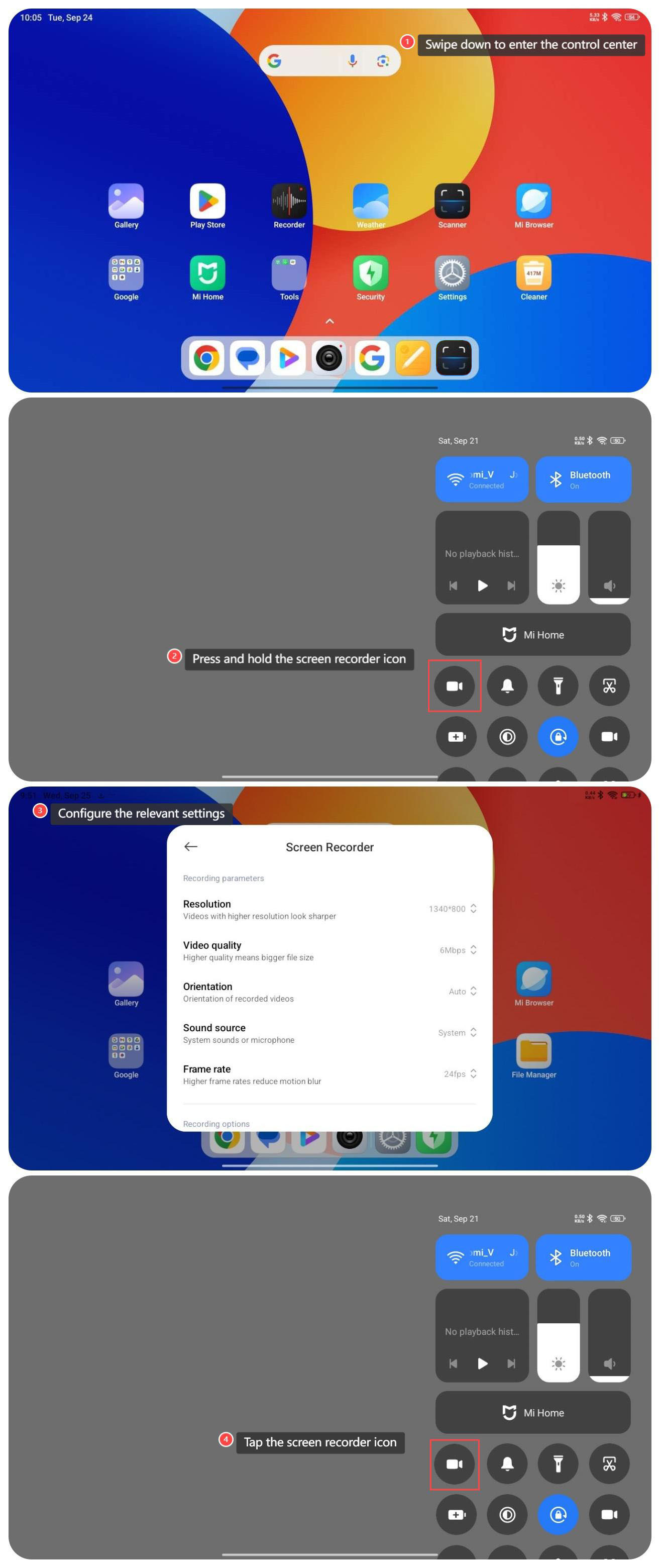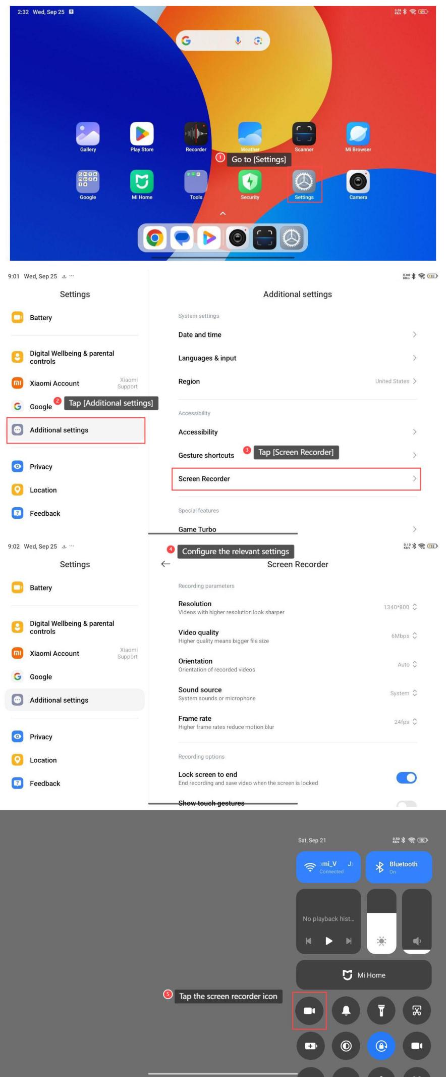 The Redmi Pad SE 8.7 supports recording screen, which captures on-screen actions, enabling you to create tutorials, share gameplay, or document activities, allowing audio recording, adjustable quality settings, and options to edit or share videos afterward. To use the screen recorder on your tablet, please refer to the following methods: Method 1: 1. Go to [Settings]; 2. Tap [Additional settings]; 3. Tap [Screen Recorder]; 4. Configure the relevant settings below [Recording parameters] and [Recording options]; 5. Swipe down from the right top of the screen to enter the control center and tap the screen recorder icon. Method 2: 1. Swipe down from the right top of the screen to enter the control center; 2. Press and hold the screen recorder icon; 3. Configure the relevant settings; 4. Swipe down from the right top of the screen to enter the control center and tap the screen recorder icon.