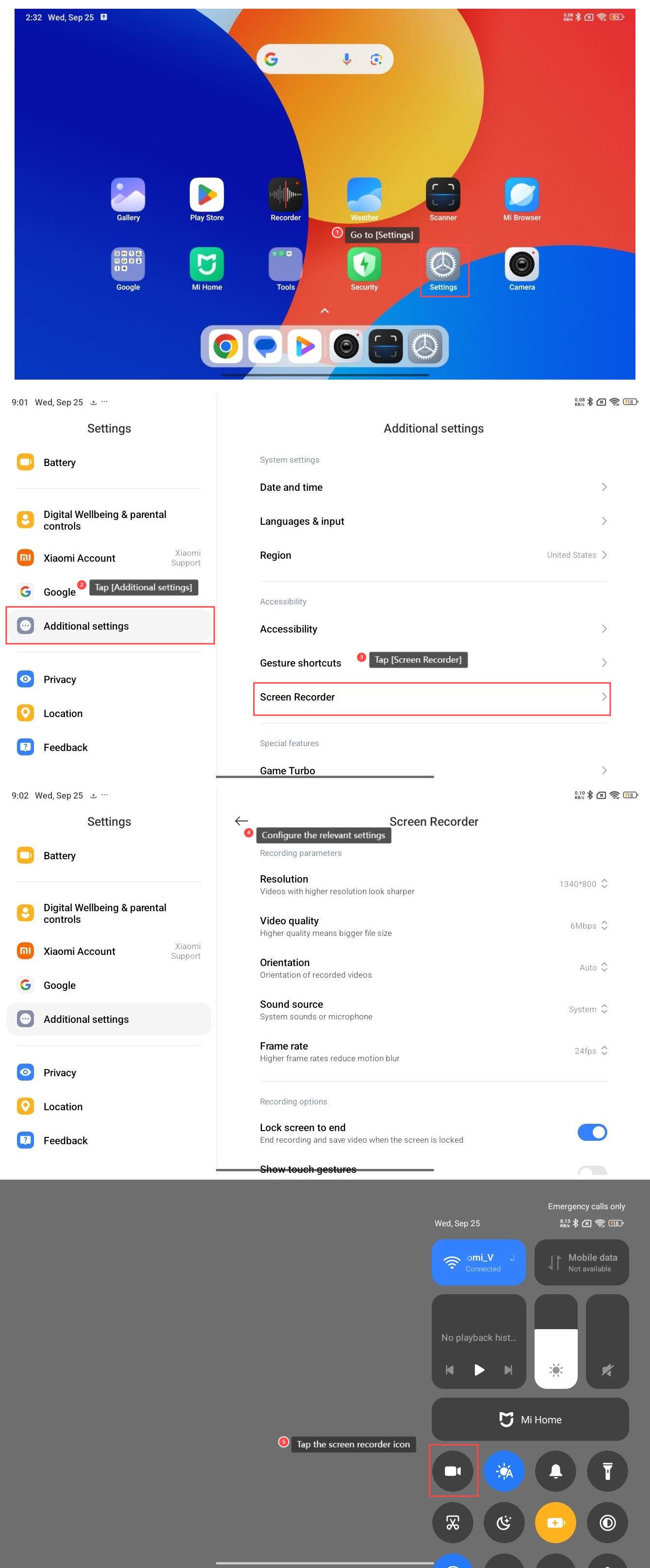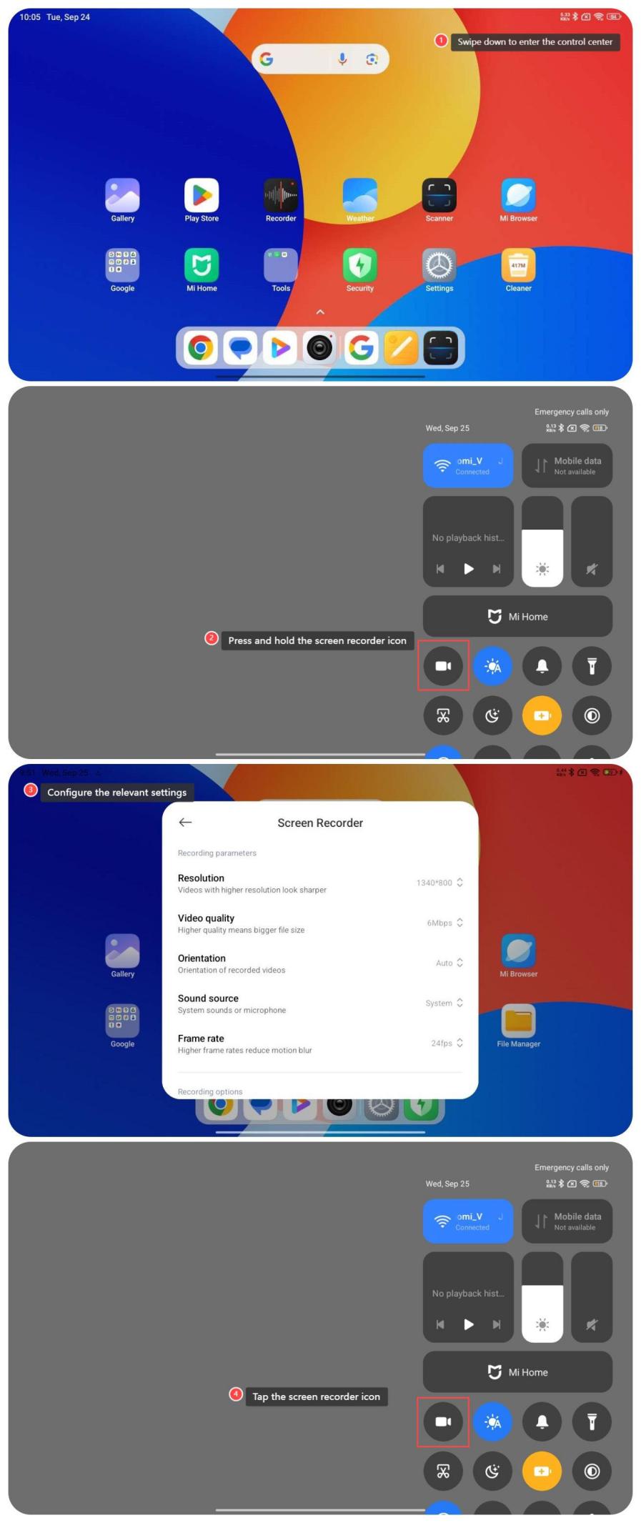 The Redmi Pad SE 8.7 4G supports recording screen, which captures on-screen actions, enabling you to create tutorials, share gameplay, or document activities, allowing audio recording, adjustable quality settings, and options to edit or share videos afterward. To use the screen recorder on your tablet, please refer to the following methods: Method 1: 1. Go to [Settings]; 2. Tap [Additional settings]; 3. Tap [Screen Recorder]; 4. Configure the relevant settings below [Recording parameters] and [Recording options]; 5. Swipe down from the right top of the screen to enter the control center and tap the screen recorder icon. Method 2: 1. Swipe down from the right top of the screen to enter the control center; 2. Press and hold the screen recorder icon; 3. Configure the relevant settings; 4. Swipe down from the right top of the screen to enter the control center and tap the screen recorder icon.