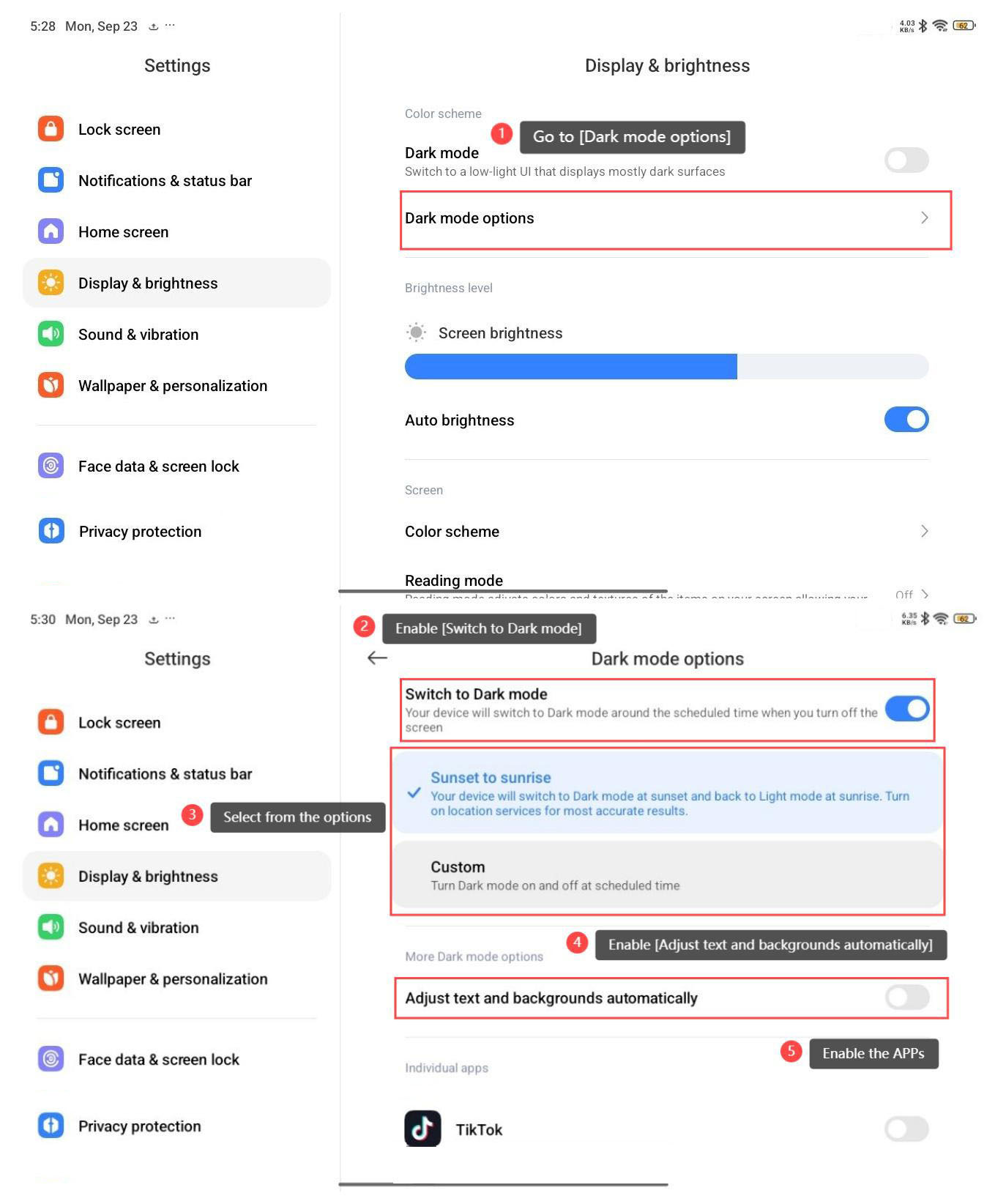 The Redmi Pad SE 8.7 supports setting dark mode, which can be easier on the eyes, especially in low-light environments, minimizing glare and discomfort. You will find text easier to read against a dark background, enhancing overall usability. Besides, dark mode can help reduce visual distractions, allowing you to focus more on content. To set the dark mode on your tablet, please refer to the following methods: Method 1: 1. Go to [Settings]; 2. Tap [Display & brightness]; 3. Enable [Dark mode]. Note: To adjust the settings of dark mode, please refer to the following steps: 1. Go to [Dark mode options]; 2. Enable [Switch to Dark mode]; 3. Select from the options to configure the scheduled time; 4. You can enable [Adjust text and backgrounds automatically], and the text and backgrounds will be adjusted automatically with the dark mode; 5. You can enable the APPs below [Individual apps], and the APP will enter the dark mode with the settings on the phone. Method 2: 1. Swipe down from the right top of the screen to enter the control center; 2. Tap the dark mode icon.