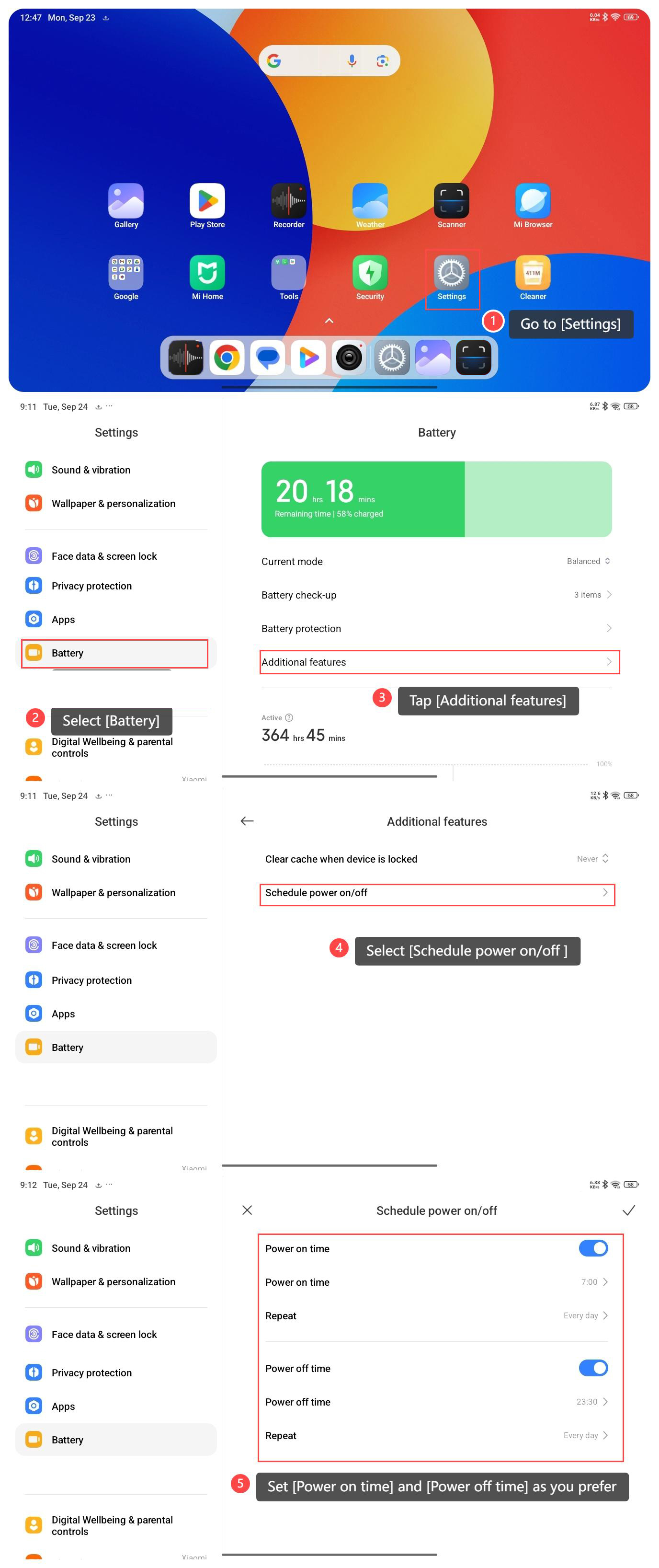To schedule power on/off on your tablet, please refer to the following steps: