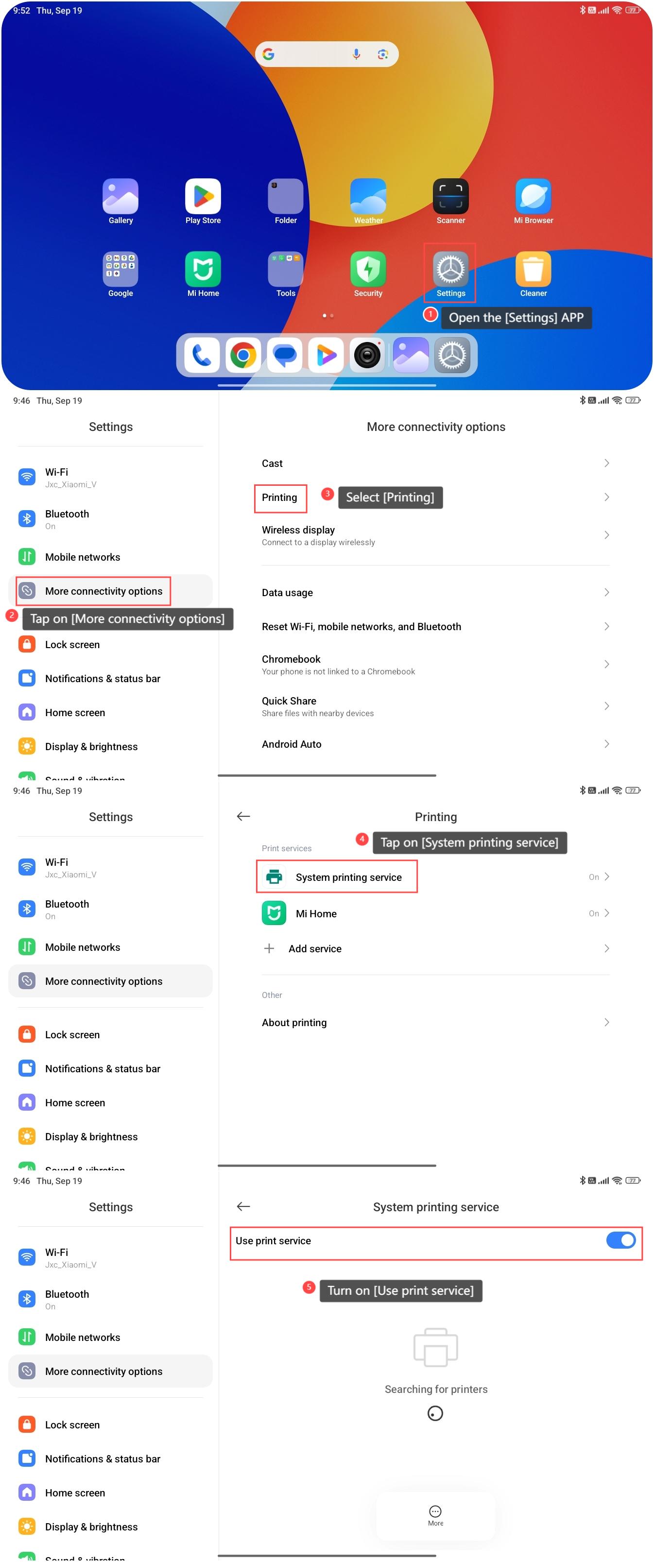 The REDMI Pad SE 8.7 4G supports connecting to a printer, allowing you to print files directly from your tablet, and no need to transfer files to the computer. This connectivity feature makes printing easier and more convenient, which significantly improves the using experience. To connect the device to a printer, please refer to the following steps: 1. Open the [Settings] APP, which looks like a gear or cogwheel icon; 2. Tap on [More connectivity options]; 3. Select [Printing]; 4. Tap on [System printing service]; 5. Turn on [Use print service]. Your device will start to search for the printer that can be connected, and you can select your printer from the list.