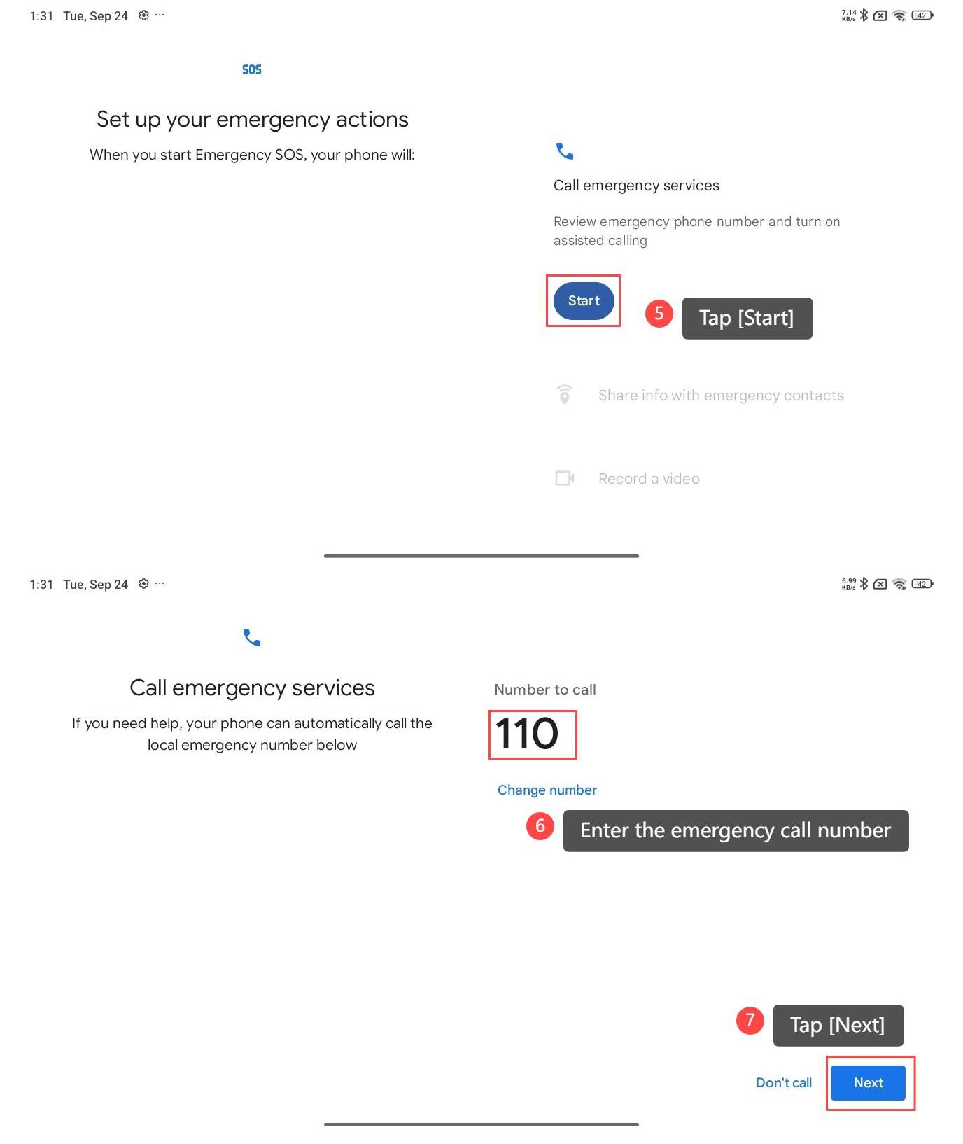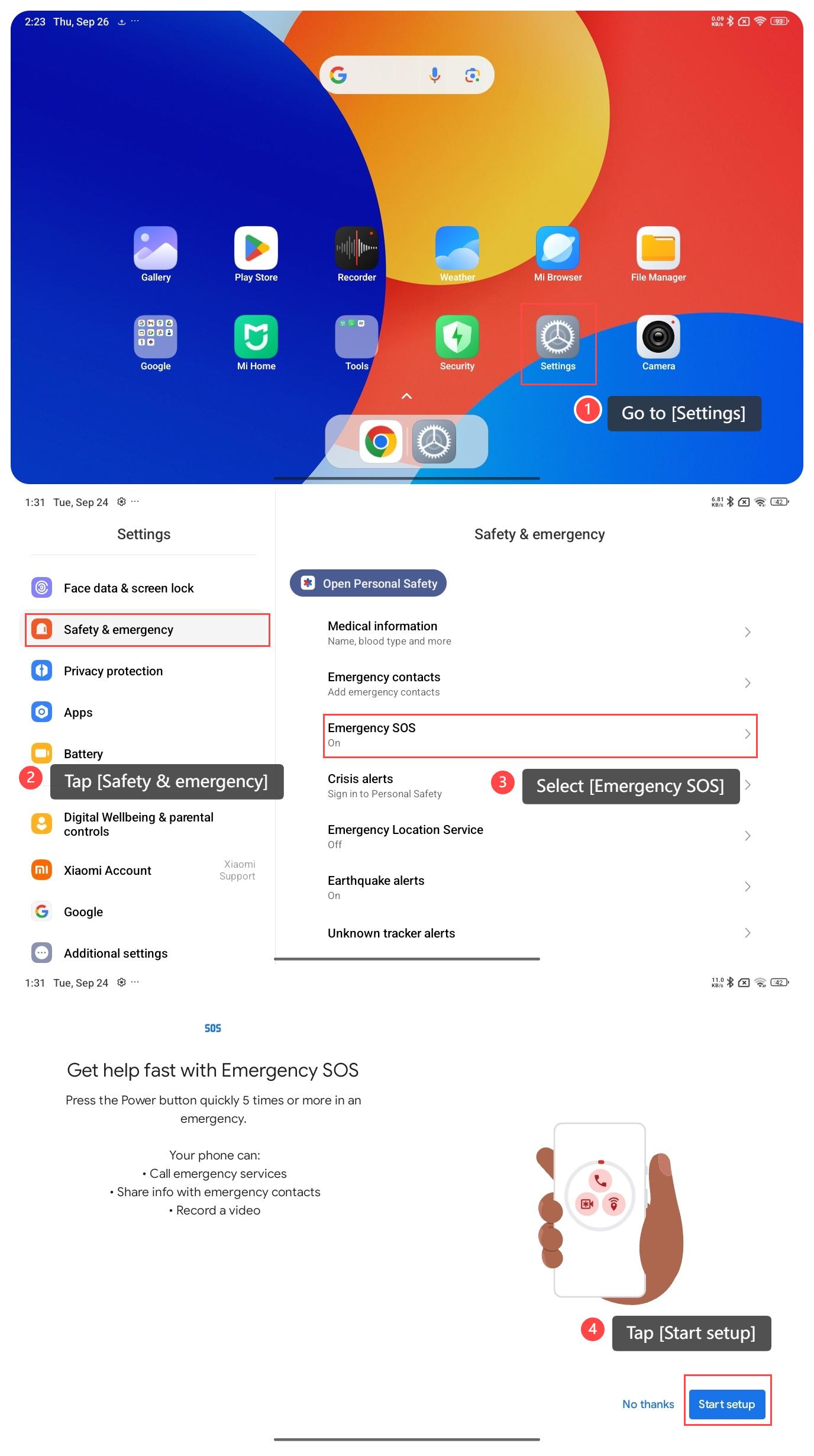 The Emergency SOS on the Redmi Pad SE 8.7 4G is designed to provide a fast and direct way to contact emergency services such as police in urgent situations. This feature on your tablet is designed to be easily accessible. It is particularly important in emergency situations where speed is essential. It's important to familiarize yourself with how to use this feature on your tablet in case of an emergency. To set the Emergency SOS on your tablet, please refer to the following steps: 1. Go to [Settings]; 2. Tap [Safety & emergency]; 3. Select [Emergency SOS] in this interface; 4. Tap [Start setup]; 5. Tap [Start]; 6. Enter the emergency call number; 7. Tap [Next] to complete the setting; 8. If you encounter an emergency crisis, please press the power button quickly 5 times to enable this feature. Note: Please ensure that you have already signed into your Google account to use the Emergency SOS on your device.