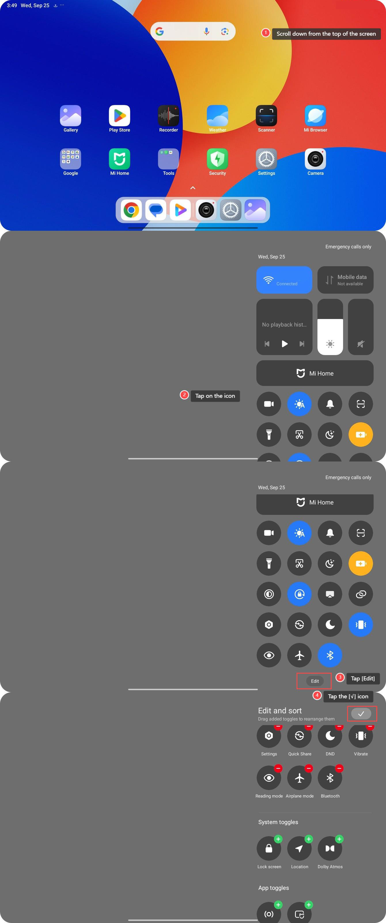 The Control Center on the Redmi Pad SE 8.7 4G is a feature that provides quick access to essential settings and notifications. It includes quick settings, notifications, shortcuts, and customization. This feature enhances convenience and efficiency in managing the device. To use Control Center, please refer to the following steps: 1. Scroll down from the top of the screen to open the Control Center; 2. Tap on the icon to quickly enable the features that you want to use; 3. Tap[Edit], then you can add or delete the icon you want to modify; 4. Tap the [√] icon to save your changes.