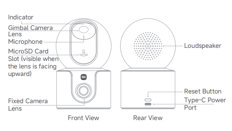 The product overview of the Xiaomi Smart Camera C300 Dual is listed below: The front view of the Xiaomi Smart Camera C300 Dual has Indicator, Gimbal Camera Lens, Microphone, MicroSD Card Slot (visible when the lens is facing upward) and Fixed Camera Lens. The rear view of the Xiaomi Smart Camera C300 Dual has Loudspeaker, Reset Button and Type-C Power Port. The packaging contents of the Xiaomi Smart Camera C300 Dual are listed below: There is a Xiaomi Smart Camera C300 Dual, a Wall Mount, a Power Adapter, a Charging Cable, a Wall Mounting Kit (with two wall plugs and two screws), a Mounting Sticker, a User Manual and a Warranty Notice.